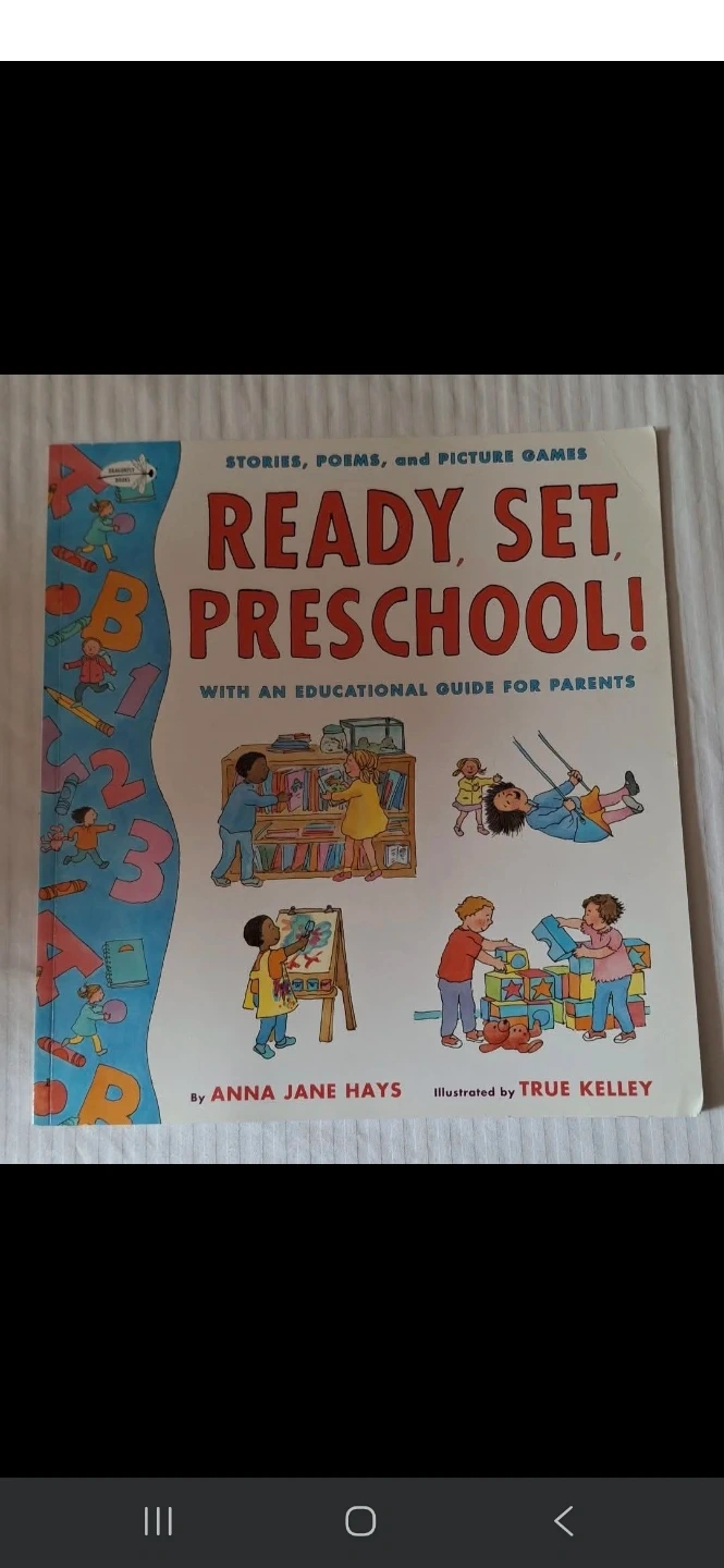 This book is called Ready, Set, Preschool! and includes stories, poems, and picture games. It also has an educational guide for parents. Written by Anna Jane Hays and illustrated by True Kelley.