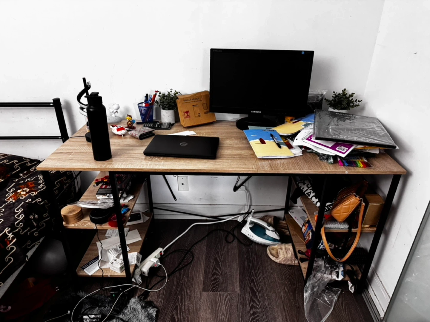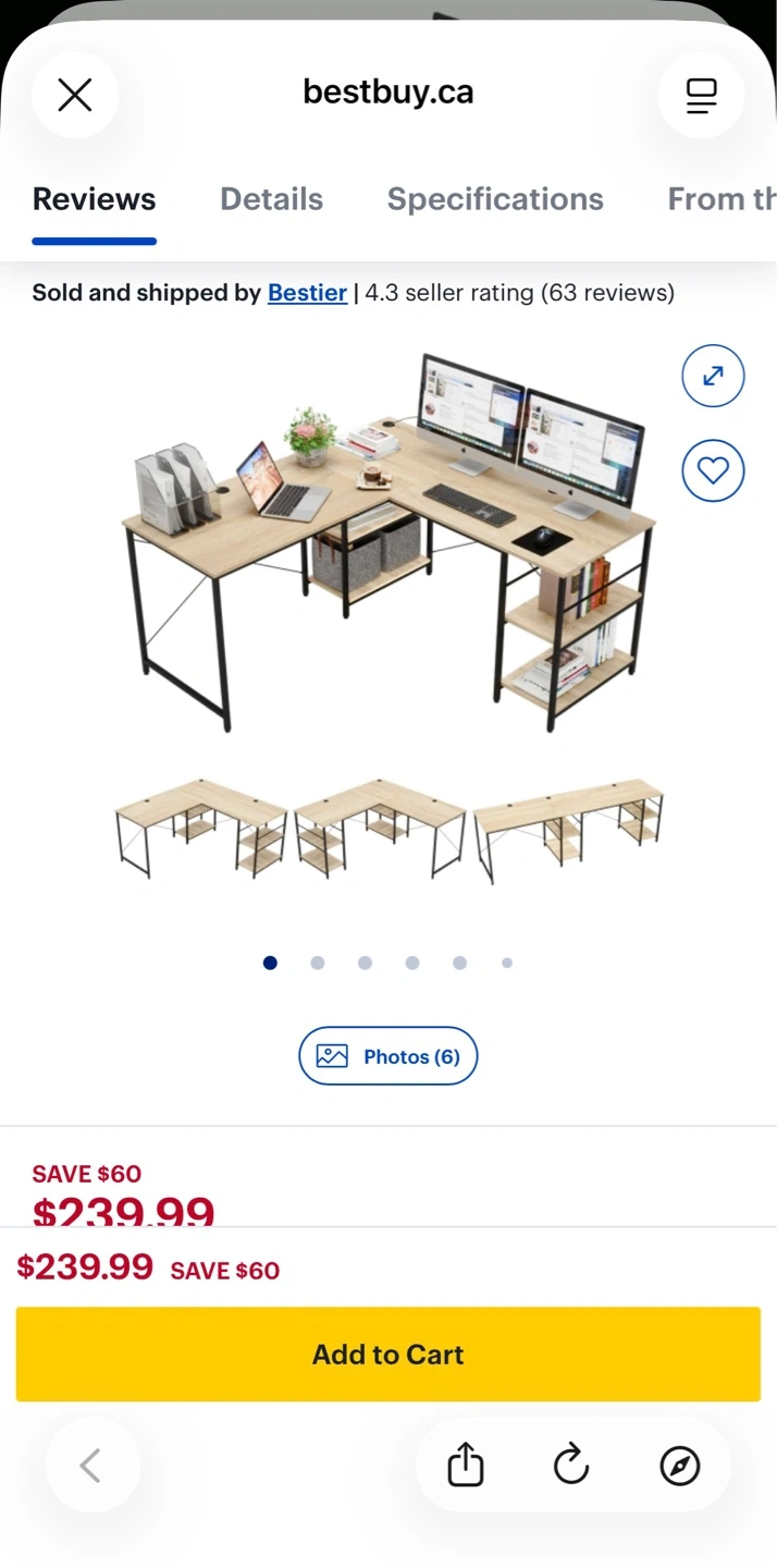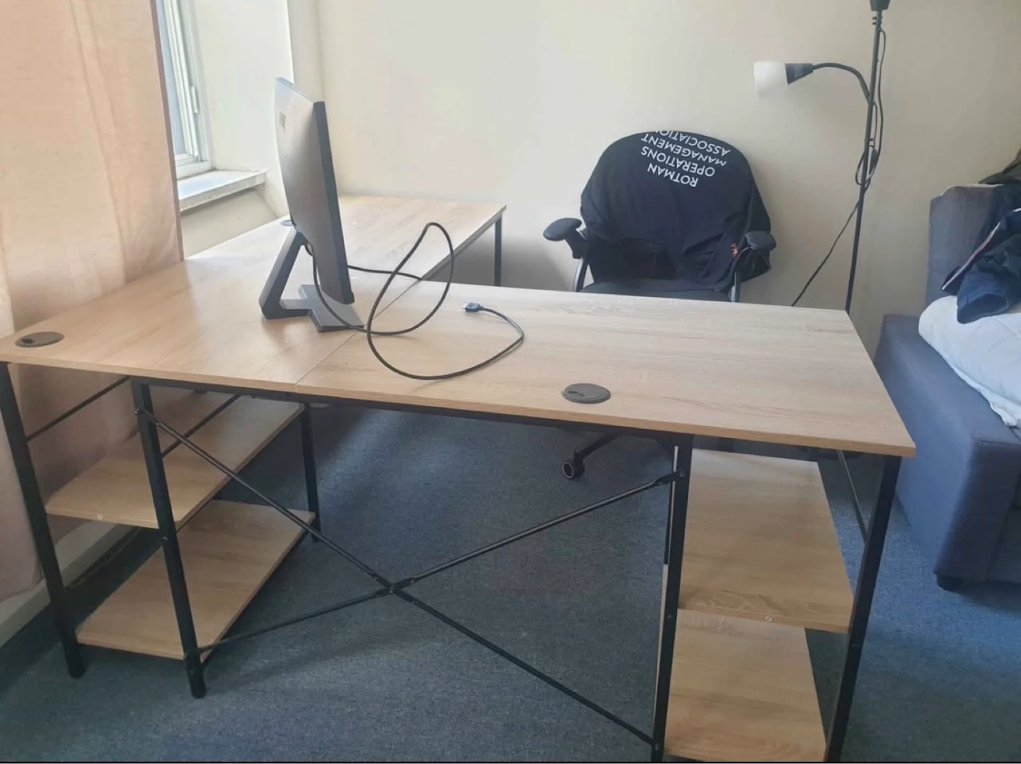 This 59.5” L-shaped desk features a maple-coloured wood top with a black metal frame. It includes two built-in shelving units for storage. This desk is great for a home office or study space. It’s a smoke and pet free environment, table is full of stuff as I am moving soon. Will be disassembled, pickup only after 20th April. The L shape part is already disassembled. You can use it like an L shape or just one side like I had if you don’t have space, no scratched and used for only 8 months. Pickup only after April 20