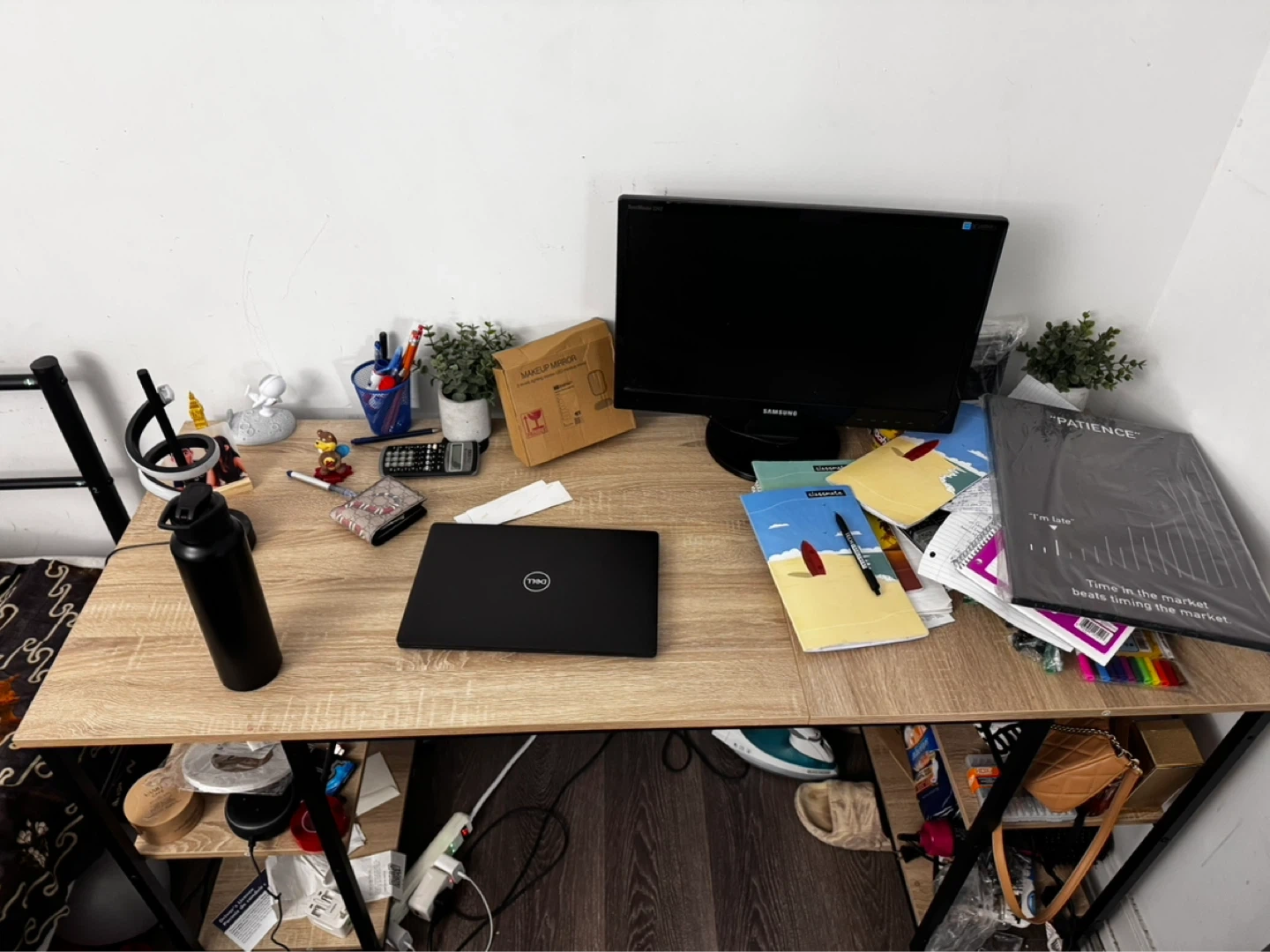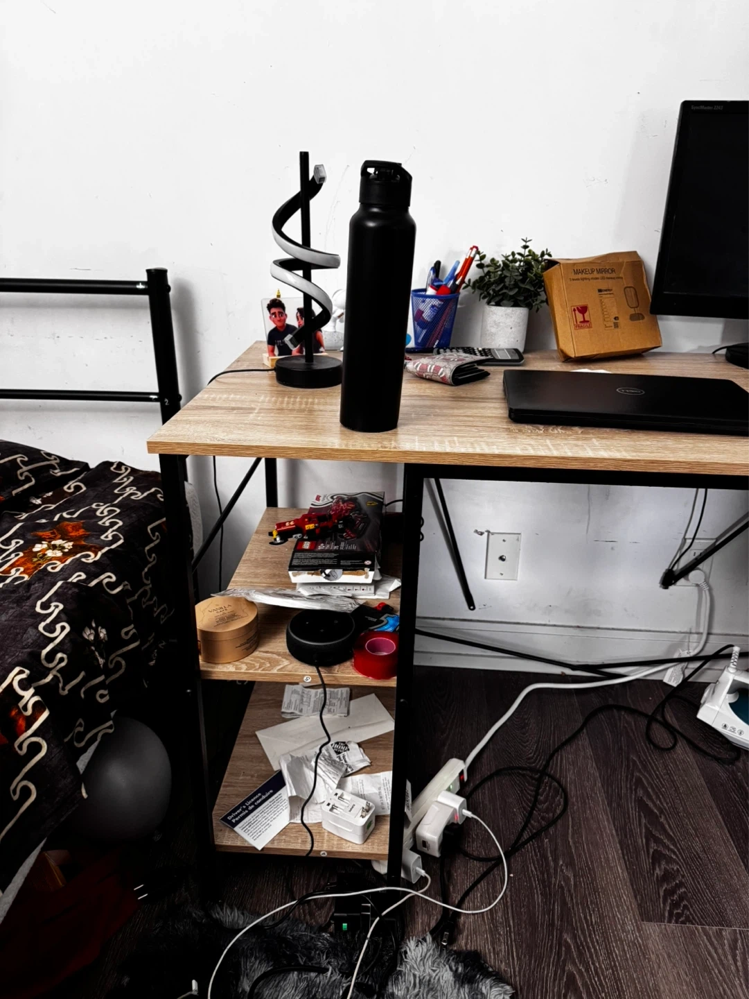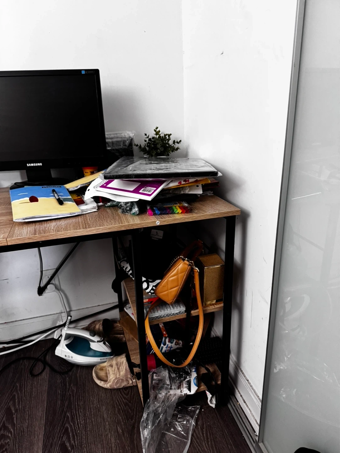 This 59.5” L-shaped desk features a maple-coloured wood top with a black metal frame. It includes two built-in shelving units for storage. This desk is great for a home office or study space. It’s a smoke and pet free environment, table is full of stuff as I am moving soon. Will be disassembled, pickup only after 20th April. The L shape part is already disassembled. You can use it like an L shape or just one side like I had if you don’t have space, no scratched and used for only 8 months. Pickup only after April 20