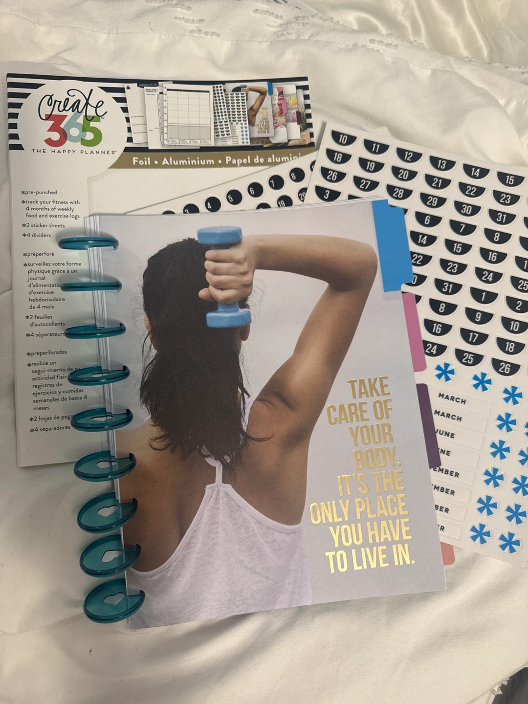 Selling a Create 365 The Happy Planner! It's perfect for tracking your fitness with a monthly planner, weekly food and exercise logs, 2 sticker sheets, and 4 dividers, so you can stay organized and motivated to reach your goals