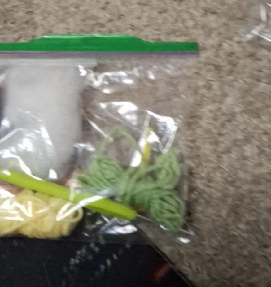 This is a crochet kit containing yarn in yellow and green, stuffing, and a crochet hook. It's all packed in a convenient zippered bag. This kit is for anyone looking to start a new craft project!