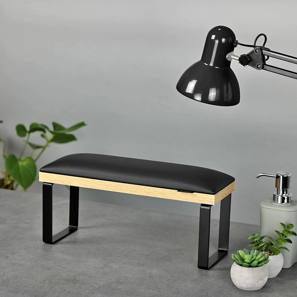 Brand new Manicure Arm Rest — ergonomic arm support for comfortable manicure work. Helps reduce arm strain and improve accuracy during long sessions. Soft padded cushion with easy-to-clean cover. Sturdy oak-finish base & metal legs. Great for salons, studios, or home use. Available colors: Black & White. Condition: New.