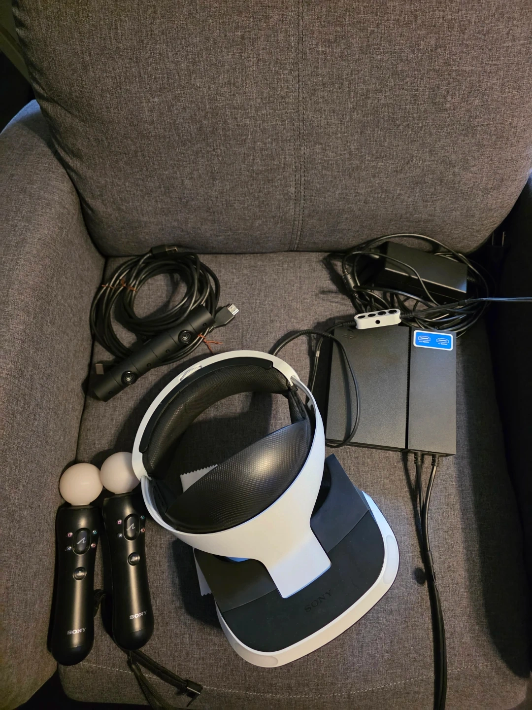 This is a Sony PlayStation VR headset with two motion controllers. It includes all the necessary cables and the processing unit for setup. It's a great way to experience immersive gaming!