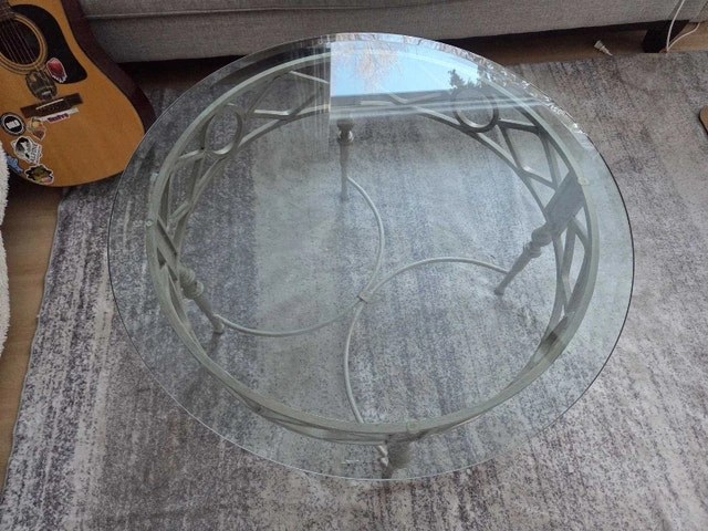 This used round glass table features a sturdy metal base and a clear glass top. The elegant design and durable construction make it a functional and attractive piece. Shape: Round. Material: Glass top with metal base. Condition: Used, with some wear consistent with age. This lovely table is looking for a new home! If the ad is still up, rest assured, it's still available for purchase. I've found similar tables listed on Kijiji for between $75 and $150. I'm asking $110 considering its condition and style. Cashless payment accepted. Cash accepted. For Sale By: Owner.
