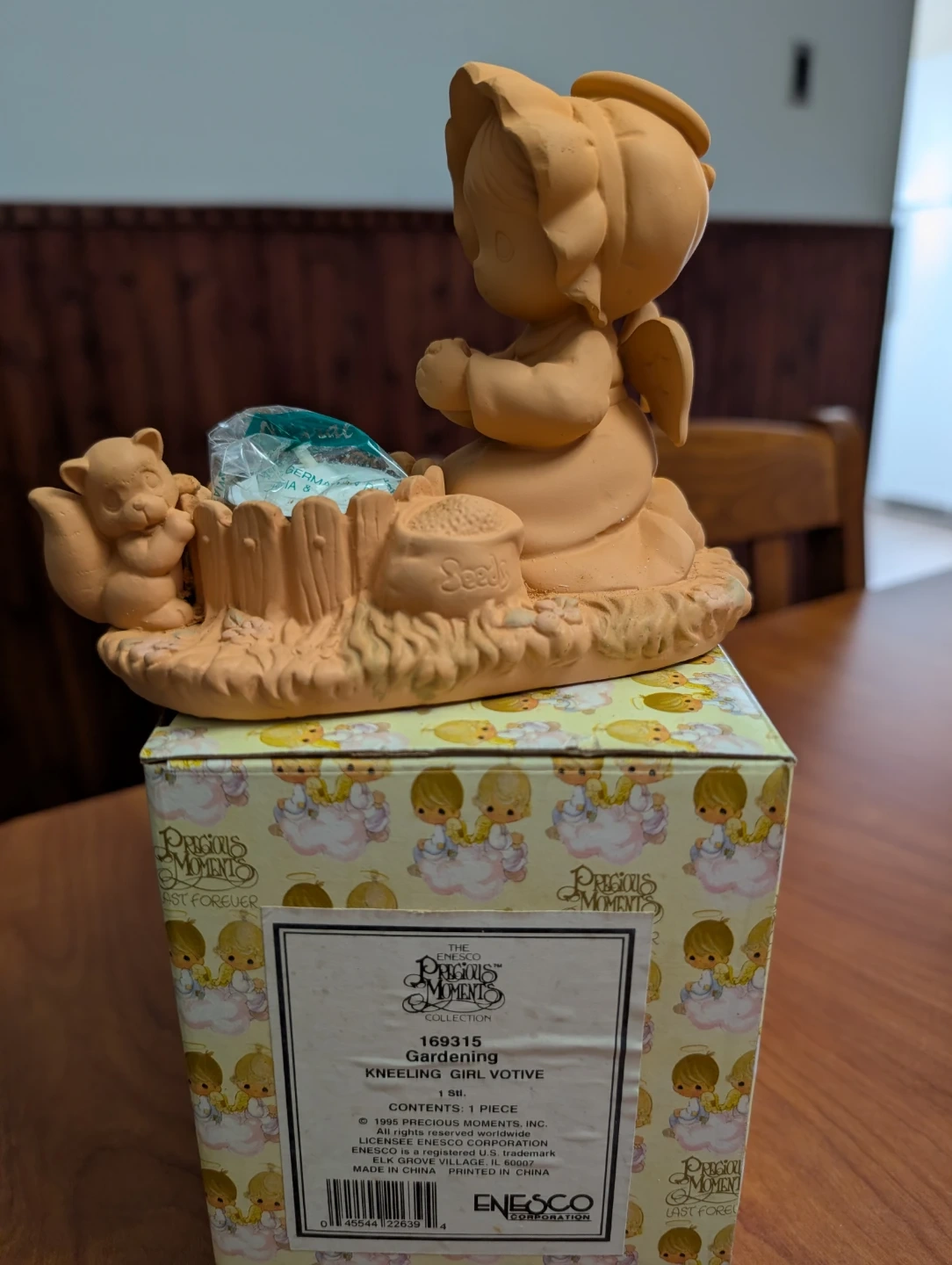 This is a Precious Moments "Gardening" kneeling girl votive figurine. It's part of the 1995 collection and comes with a squirrel detail and a small bag labelled "Seeds". The figurine is made of ceramic and is unpainted.