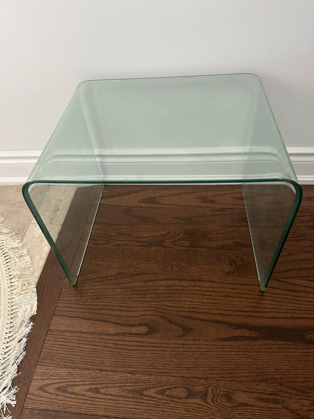 This is a sleek clear glass waterfall side table. It's made entirely of glass with smooth, rounded edges. No cracks or chips!