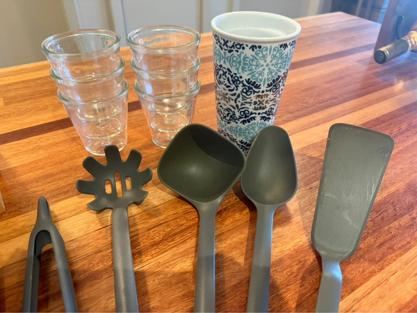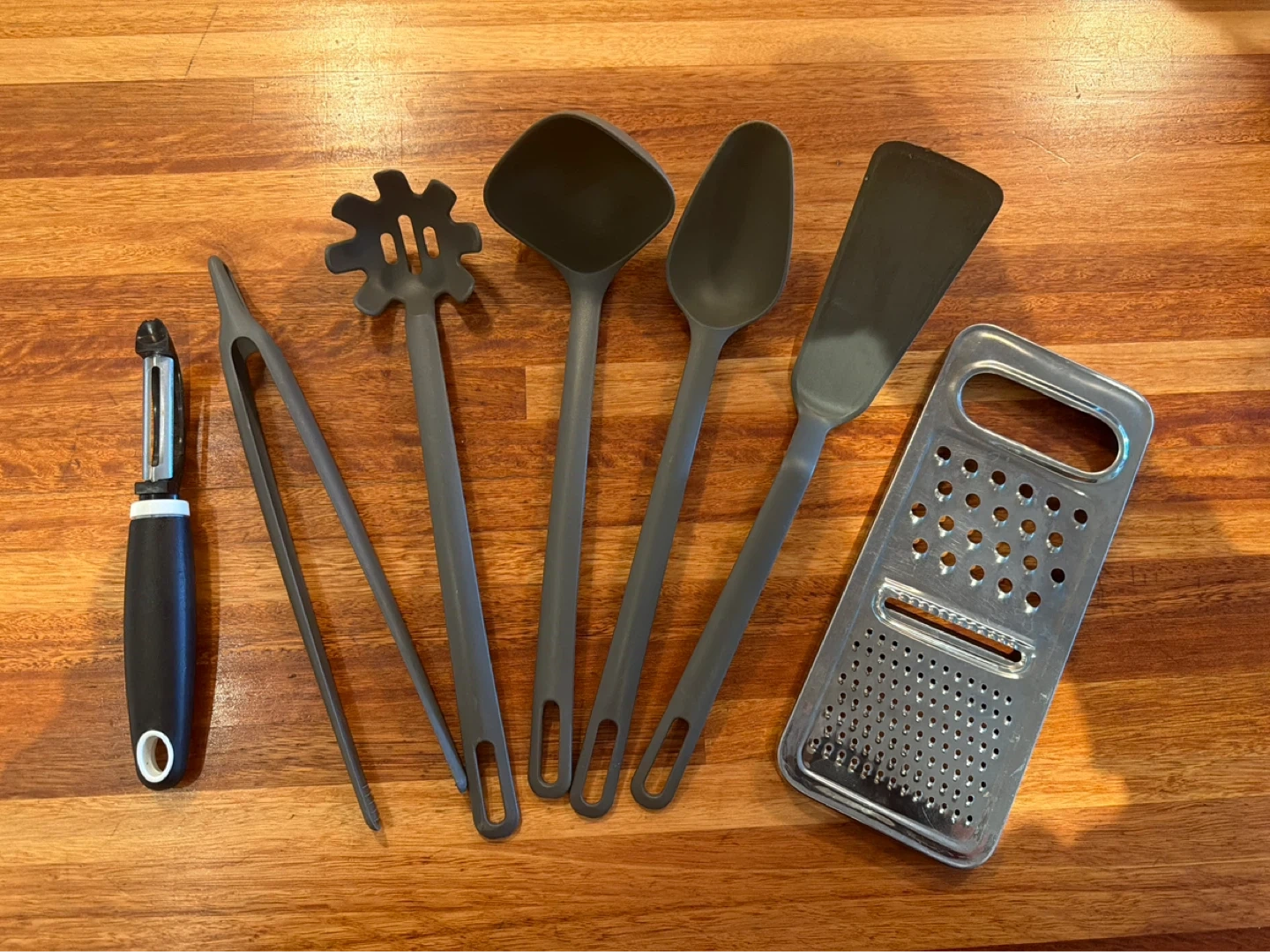 Set of kitchen utensils: peeler, tongs, spaghetti server, ladle, spoon, and spatula.