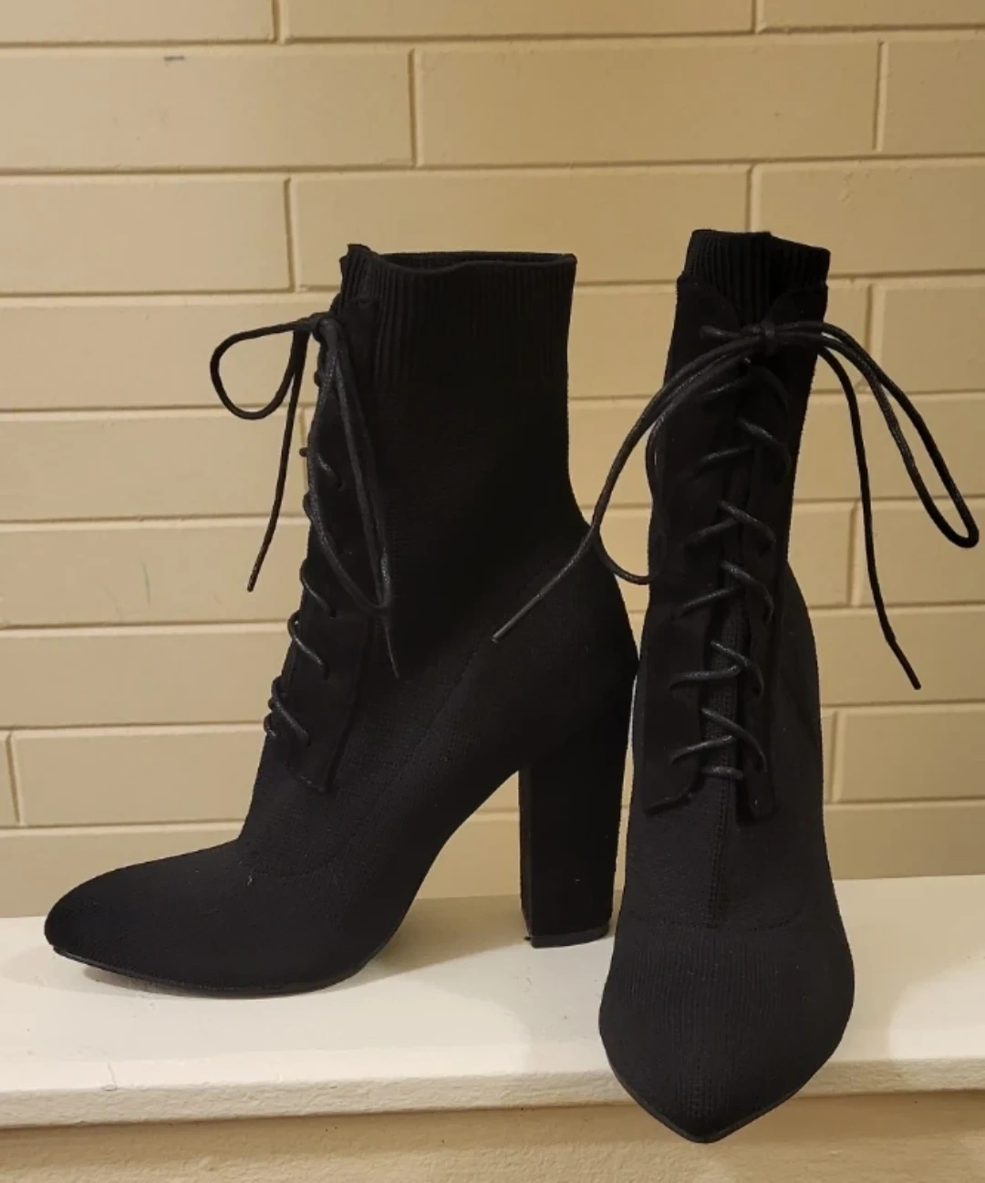 Black knit ankle boots with a pointed toe and heel. They feature a lace-up front closure. Heel height appears to be around 3-4 inches. Size is marked as 6 on the sole. These boots are made with a stretchy knit material.