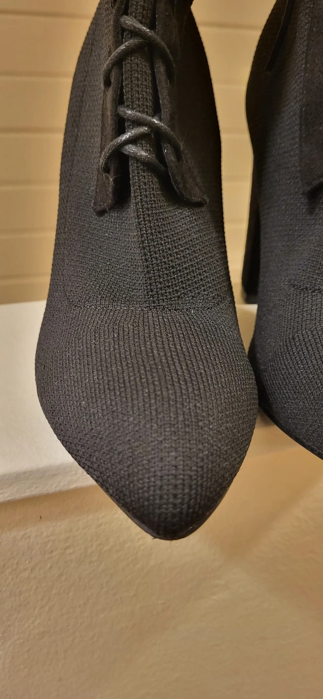 Black knit ankle boots with a pointed toe and heel. They feature a lace-up front closure. Heel height appears to be around 3-4 inches. Size is marked as 6 on the sole. These boots are made with a stretchy knit material.