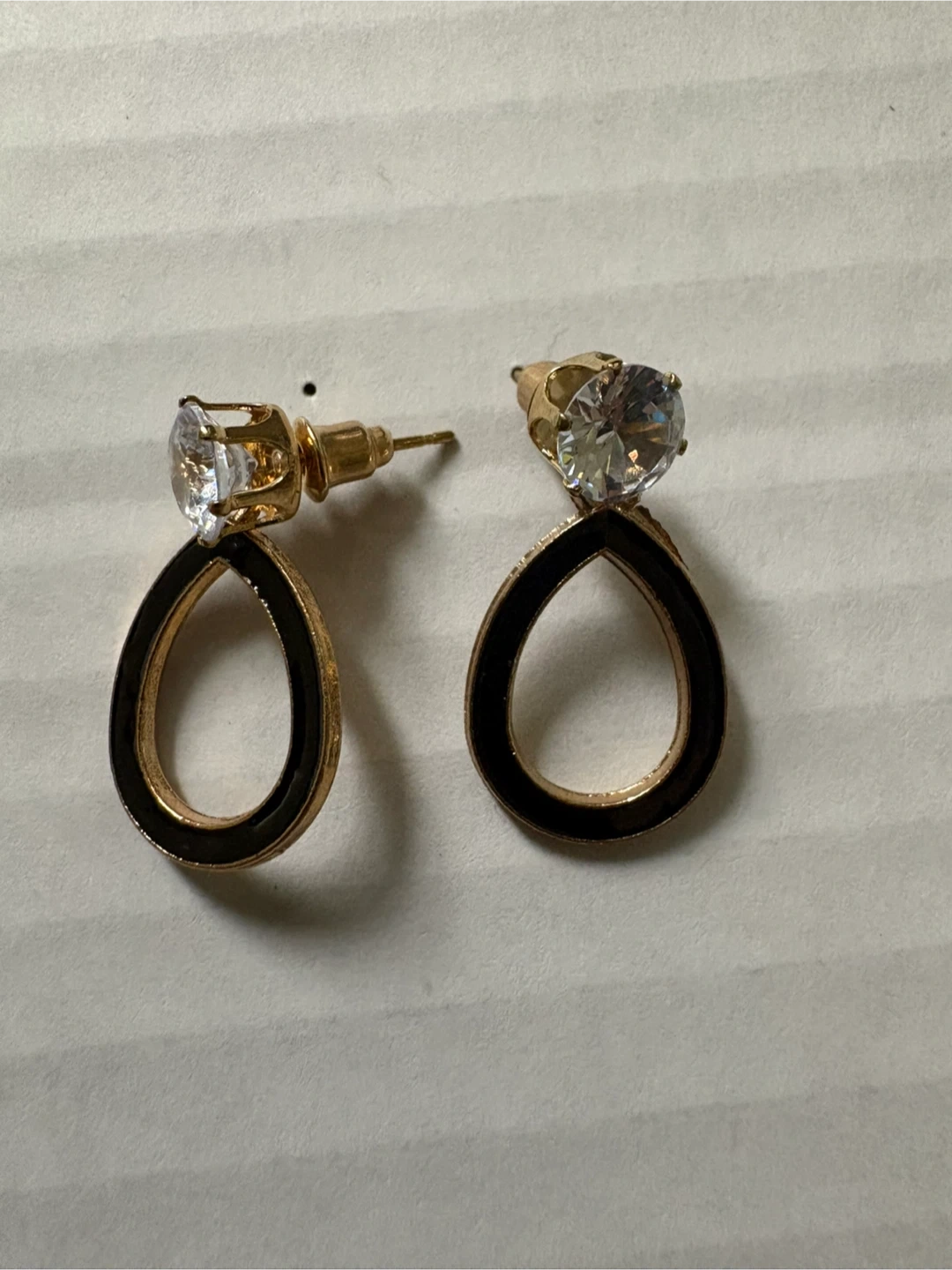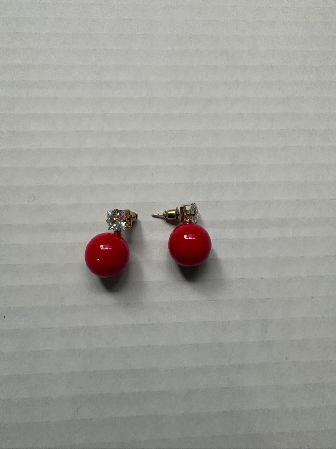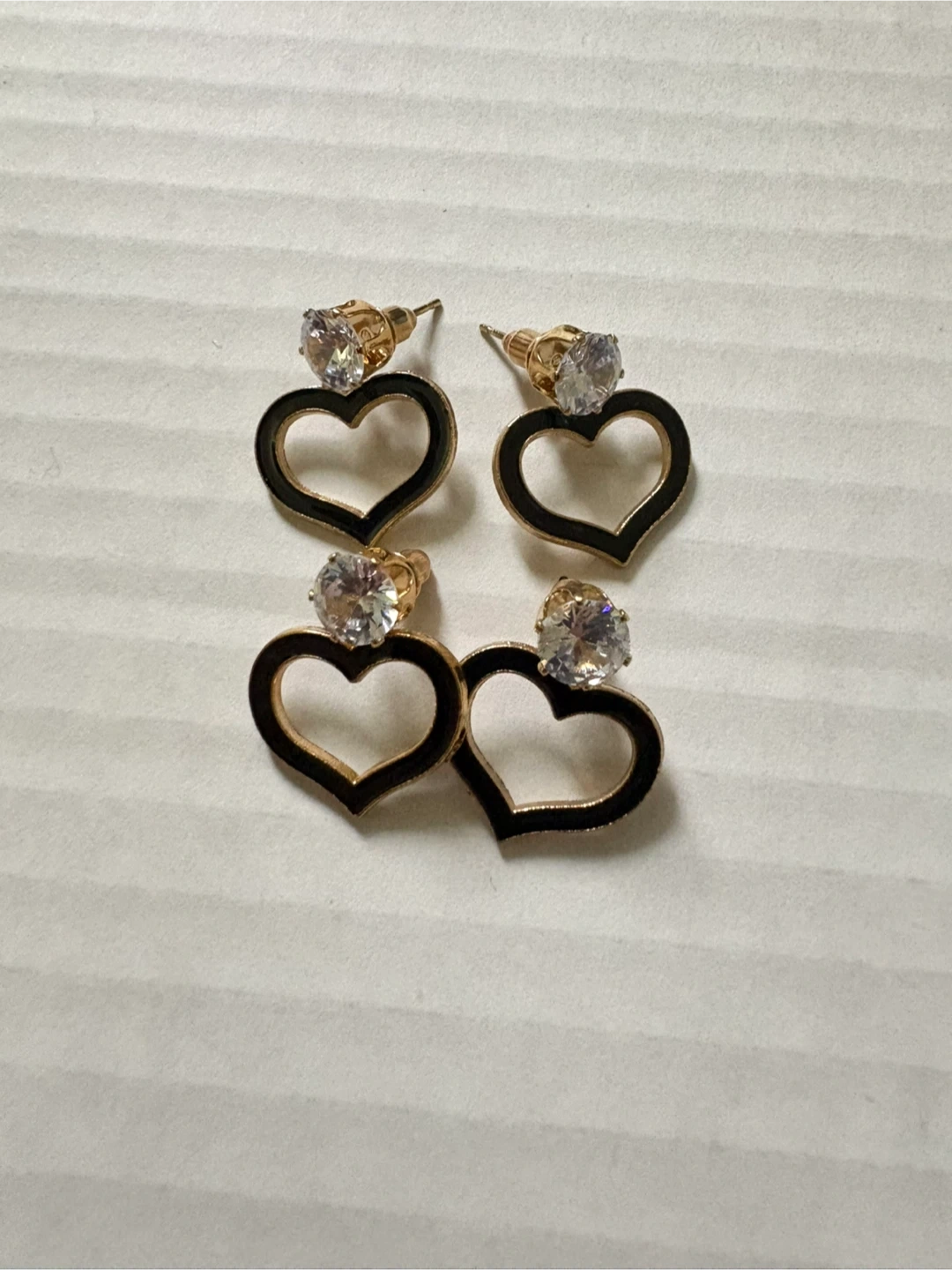 Five pairs of fashion earrings with various designs. Includes round bead, teardrop, heart, and rectangular shapes. Gold-tone metal with faux gemstones. 5$ each