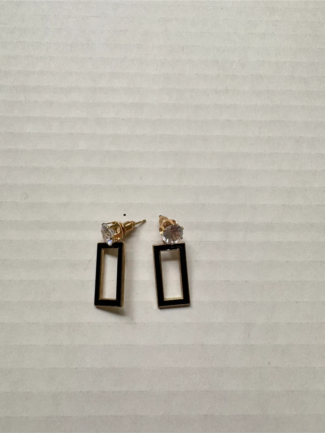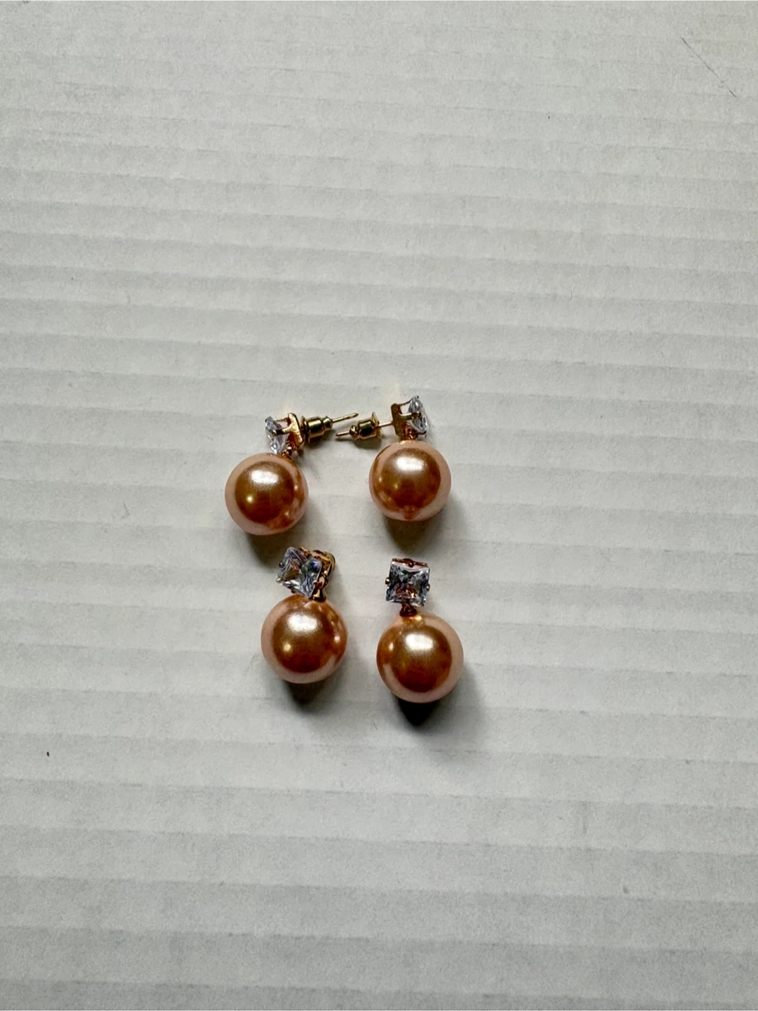 Five pairs of fashion earrings with various designs. Includes round bead, teardrop, heart, and rectangular shapes. Gold-tone metal with faux gemstones. 5$ each