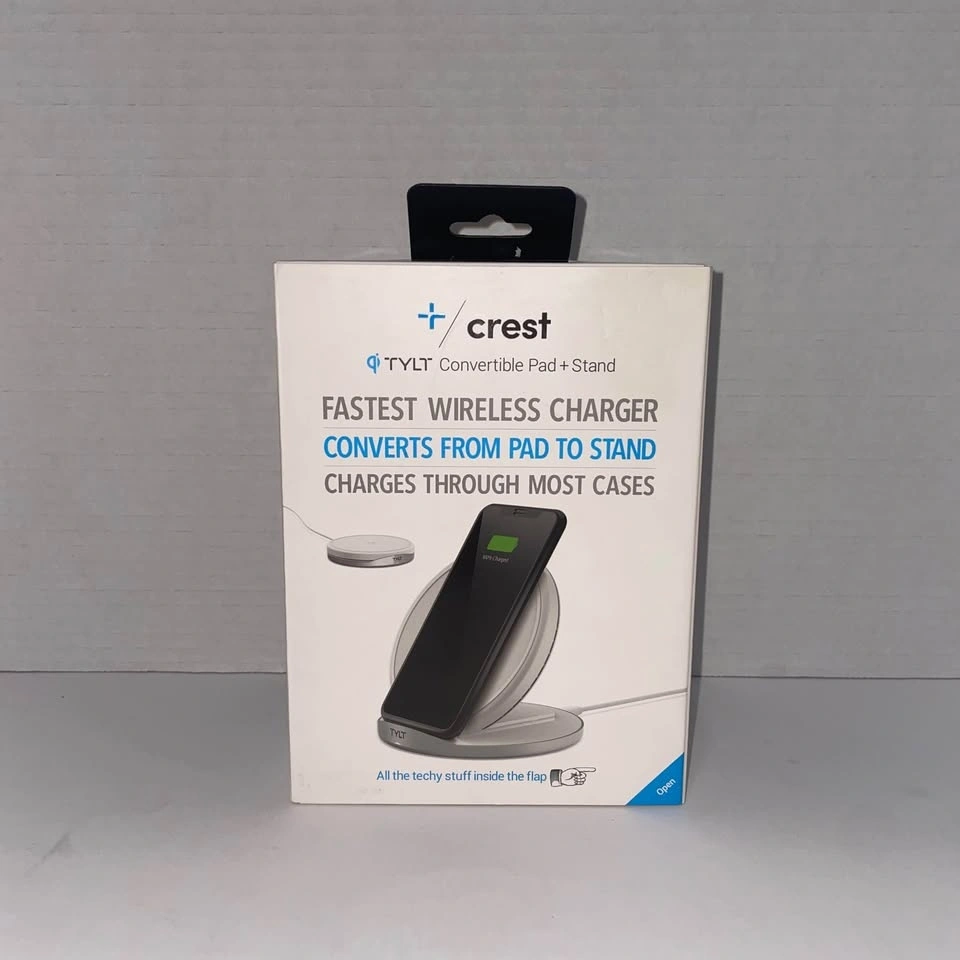 TYLT wireless charger in perfect condition. Convertible pad + stand model, great for charging your phone flat or upright. Fast charging, works through most cases. Very convenient for the office, home, or nightstand. Ready to use, great quality.