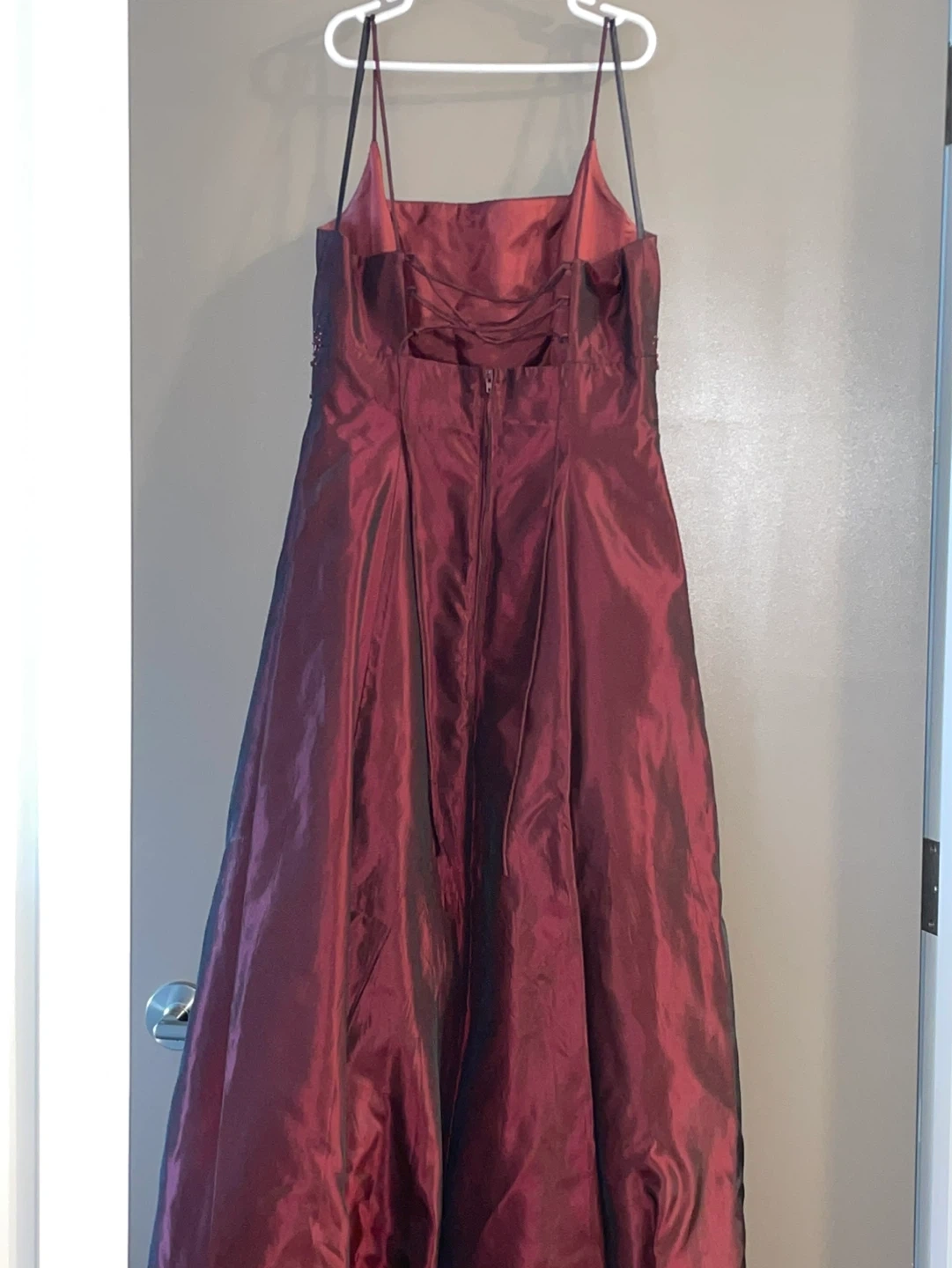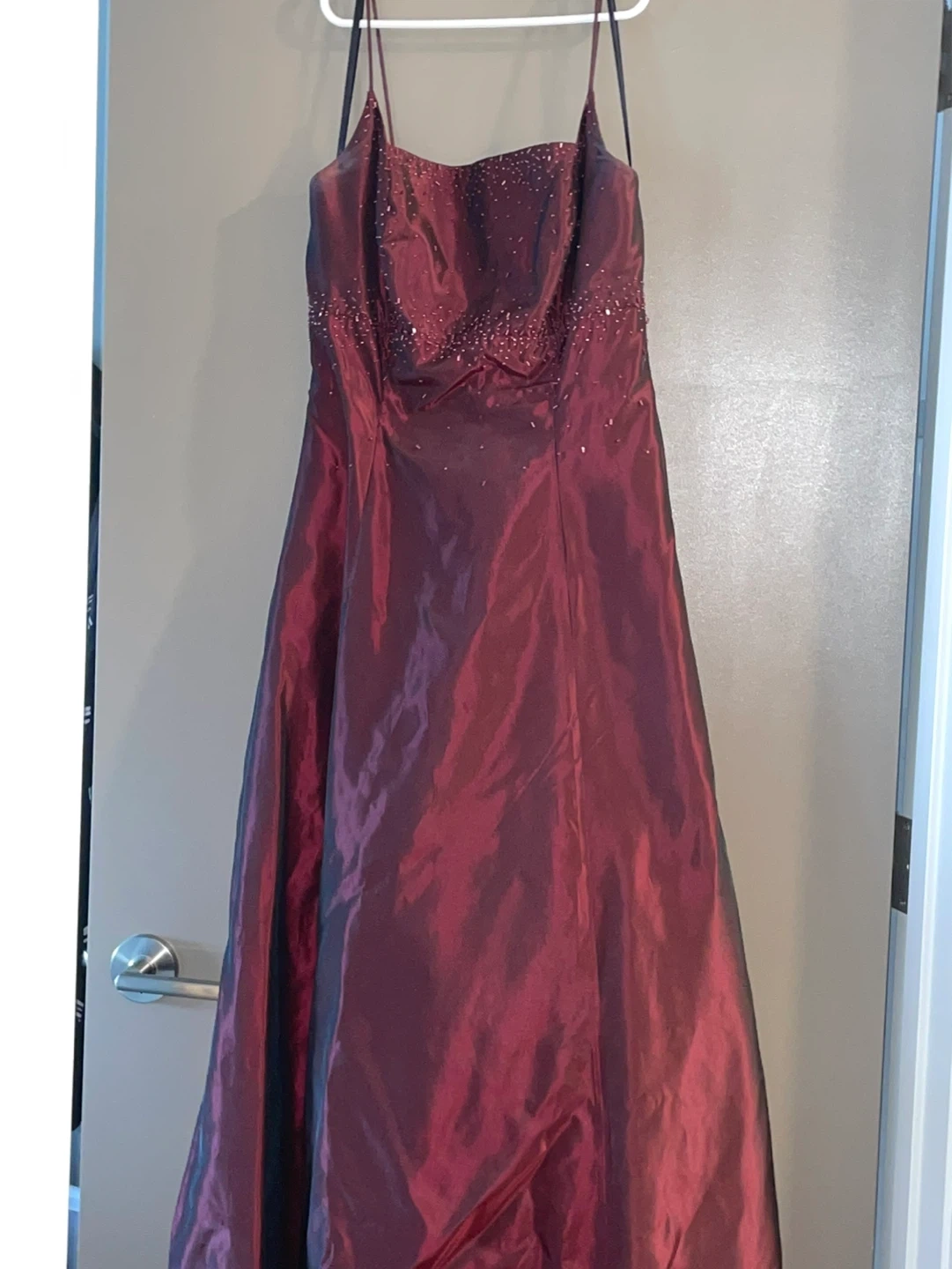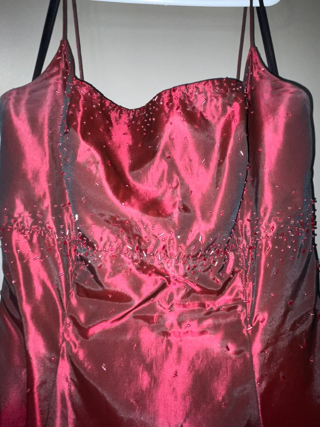 2001 Graduation Dress. It has a red and black sheen, featuring intricate beading on the bodice, corset back and a flowing skirt. It's made with 100% acetate for a beautiful sheen. Size 7/8.
