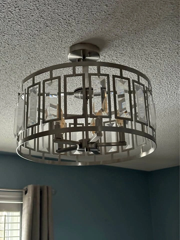 Stylish semi-flush mount ceiling light with a brushed nickel finish. Features a cool geometric design with clear crystal accents. This light fixture has three bulbs and adds a modern touch. Pick up in Bolton.