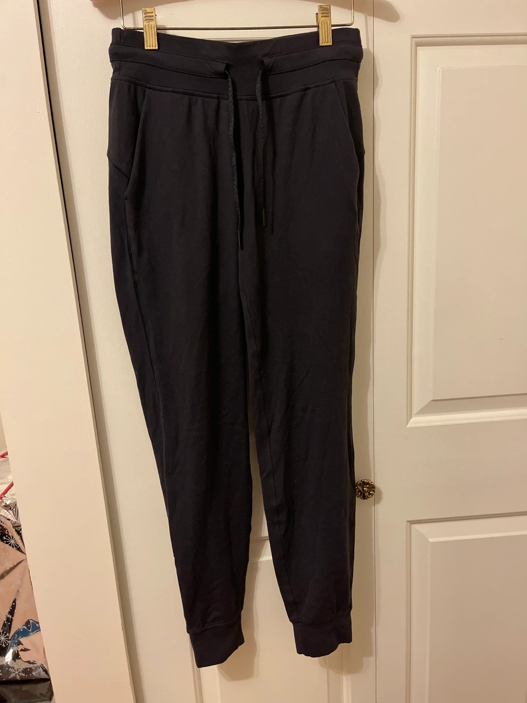 Selling a pair of Lululemon black jogger pants! They are in great condition and super comfy for lounging or working out. The material is soft and they have a drawstring waist for a perfect fit