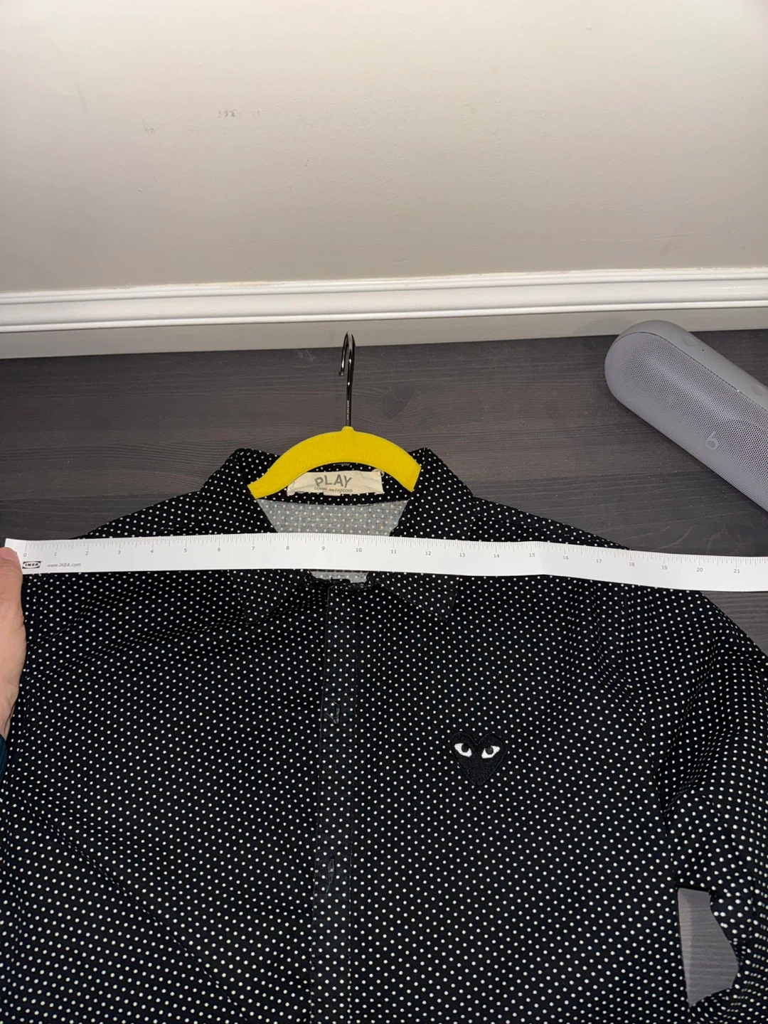 Vintage Comme des Garçons PLAY shirt with a polka dot pattern. It features the iconic heart logo.