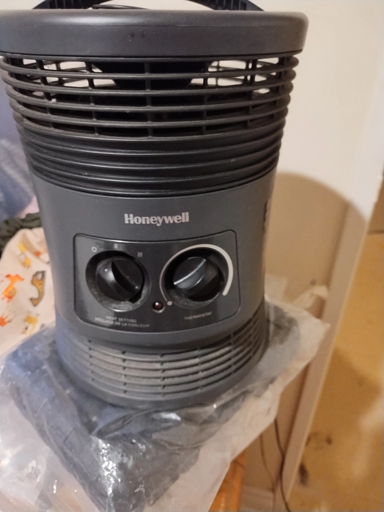 Used Honeywell fan heater. Features adjustable thermostat and heat settings. Compact size, ideal for small spaces. Shows some minor wear.