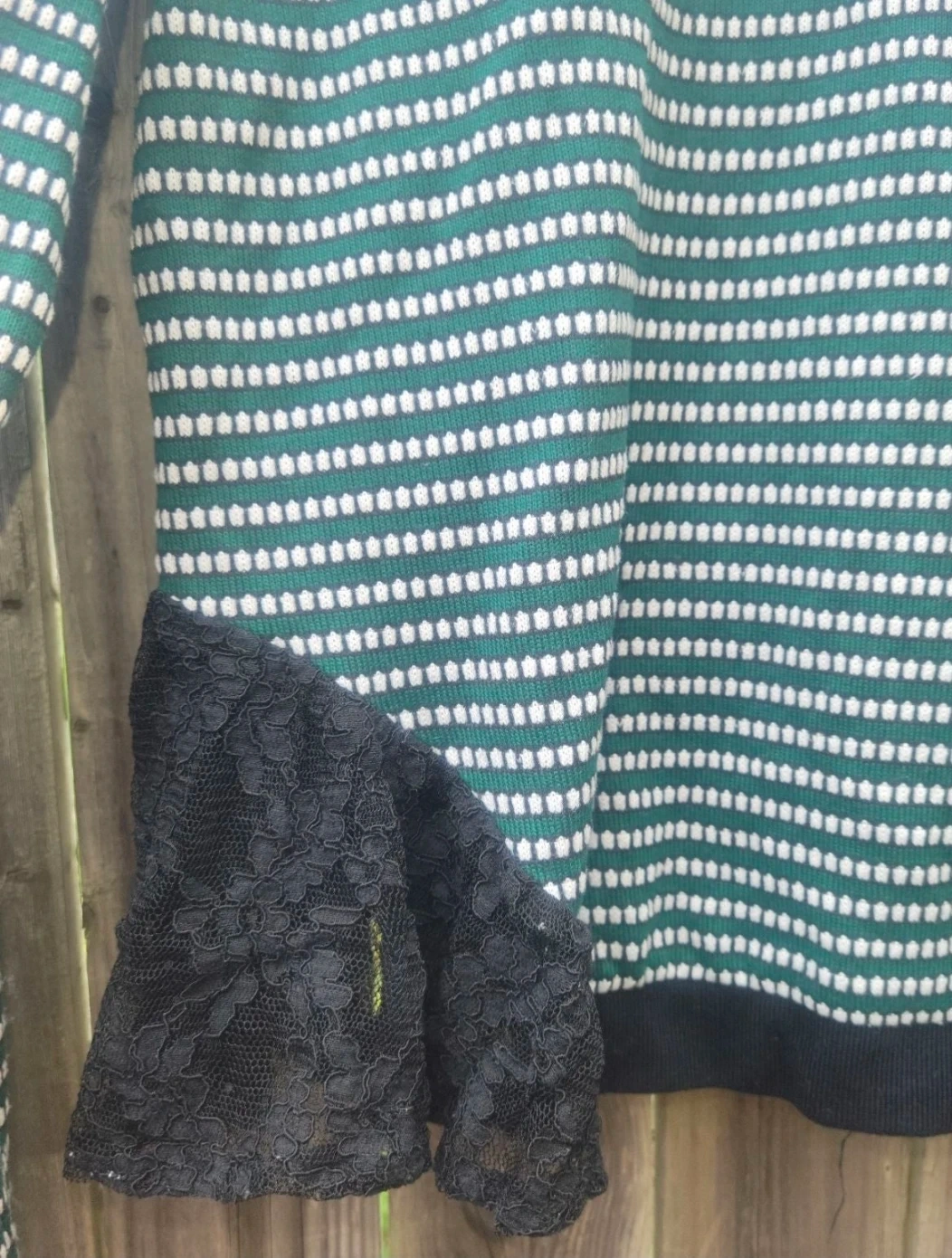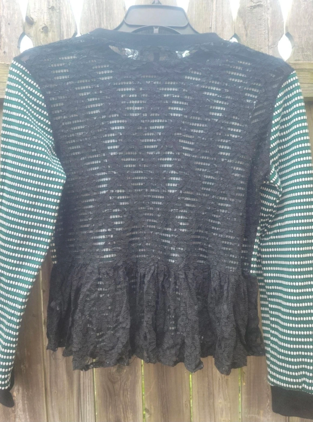 Cute long sleeve top with green and white stripes and a black lace trim. It's in great condition and ready for a new home!