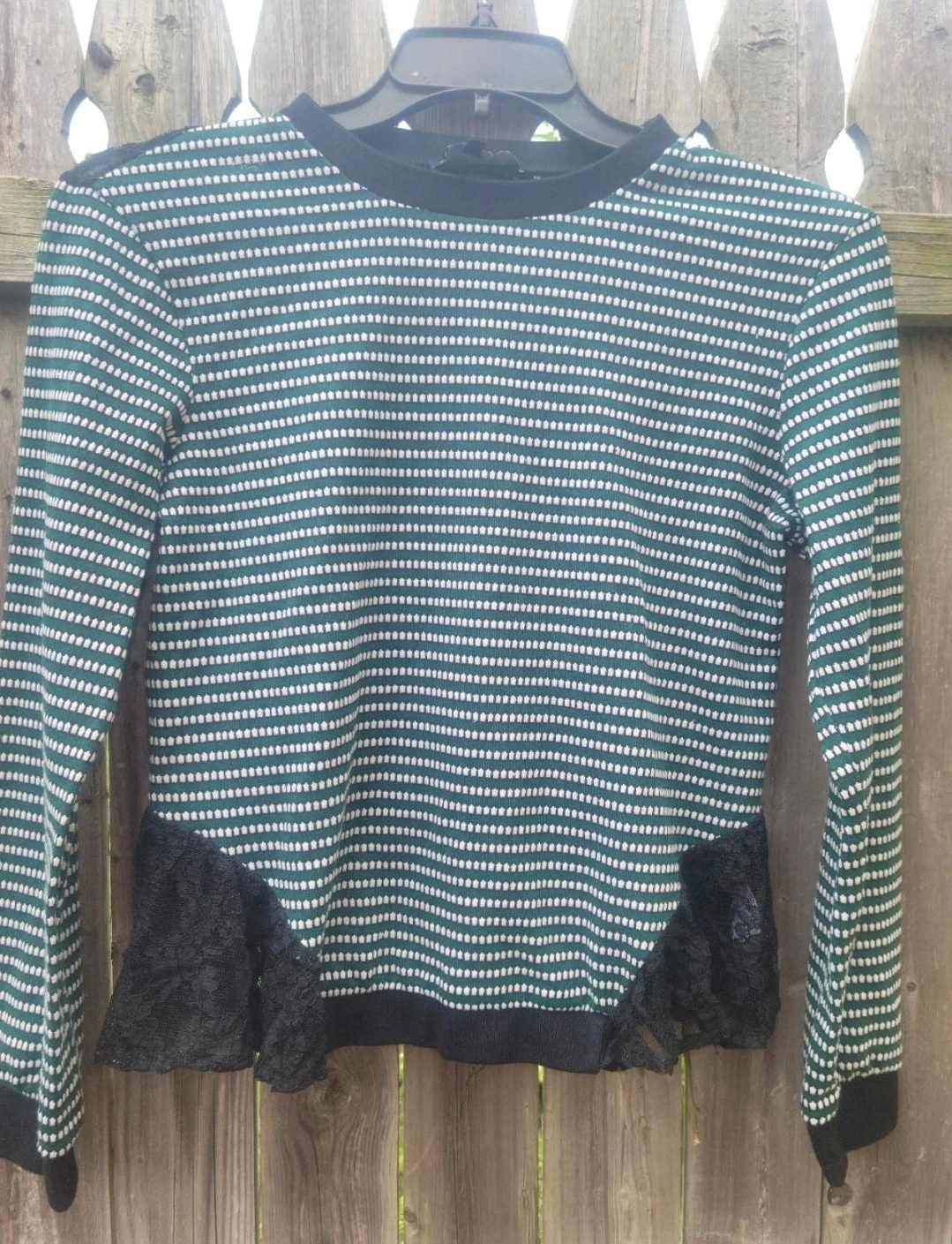 Cute long sleeve top with green and white stripes and a black lace trim. It's in great condition and ready for a new home!