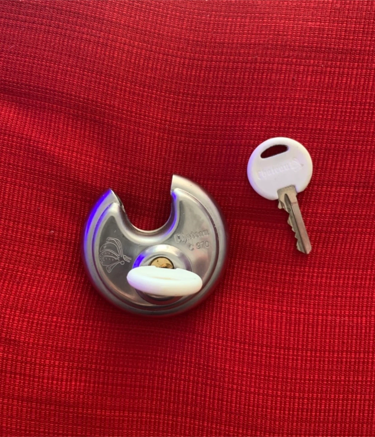 This is a Chateau C970 disc lock. It's made of stainless steel and includes two keys. This lock offers a good level of security for various applications.