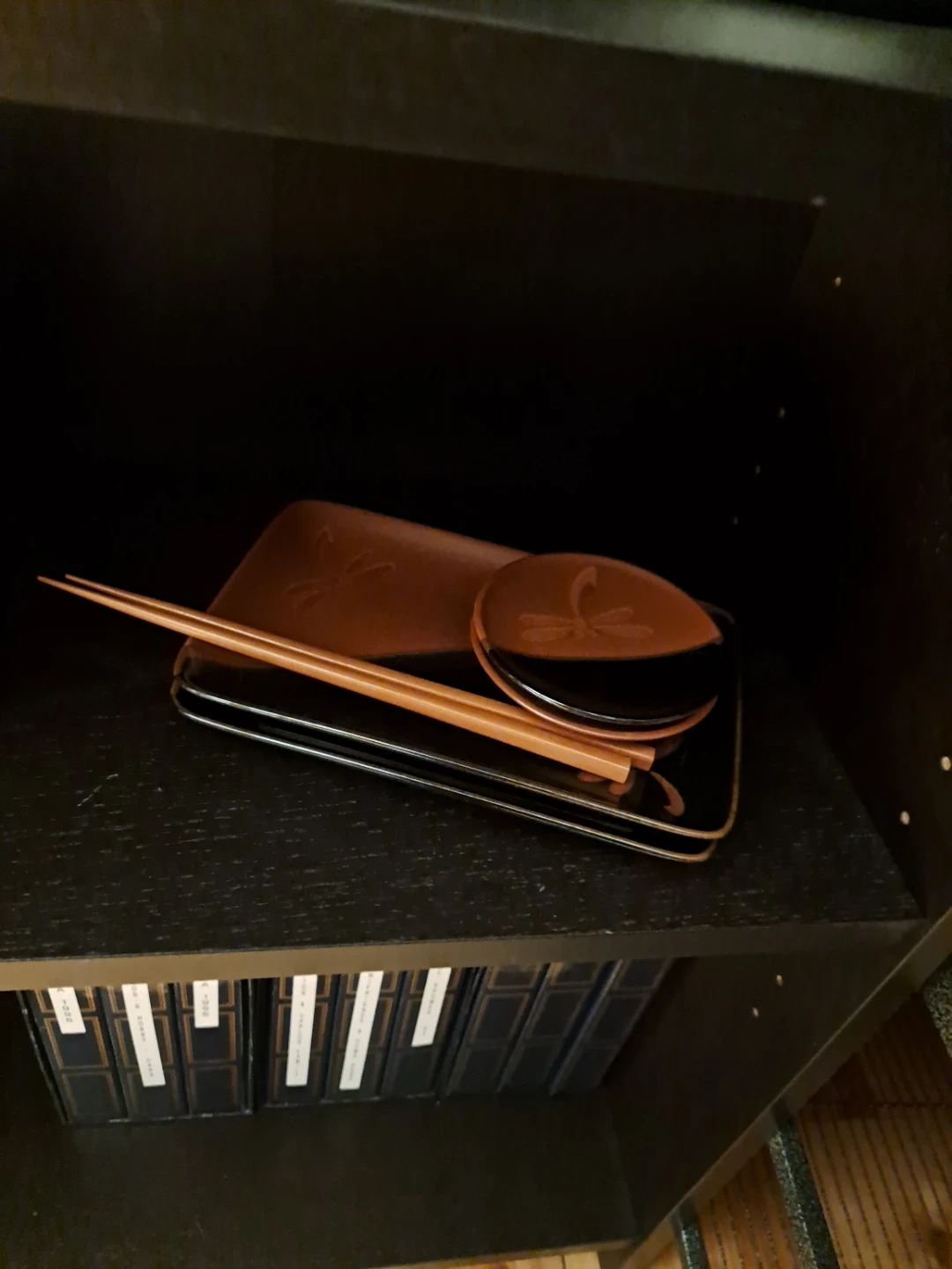 Set includes two black rectangular trays and two small black dipping bowls, each with a delicate dragonfly design. Also comes with a pair of wooden chopsticks. Perfect for enjoying a meal or for serving appetizers!