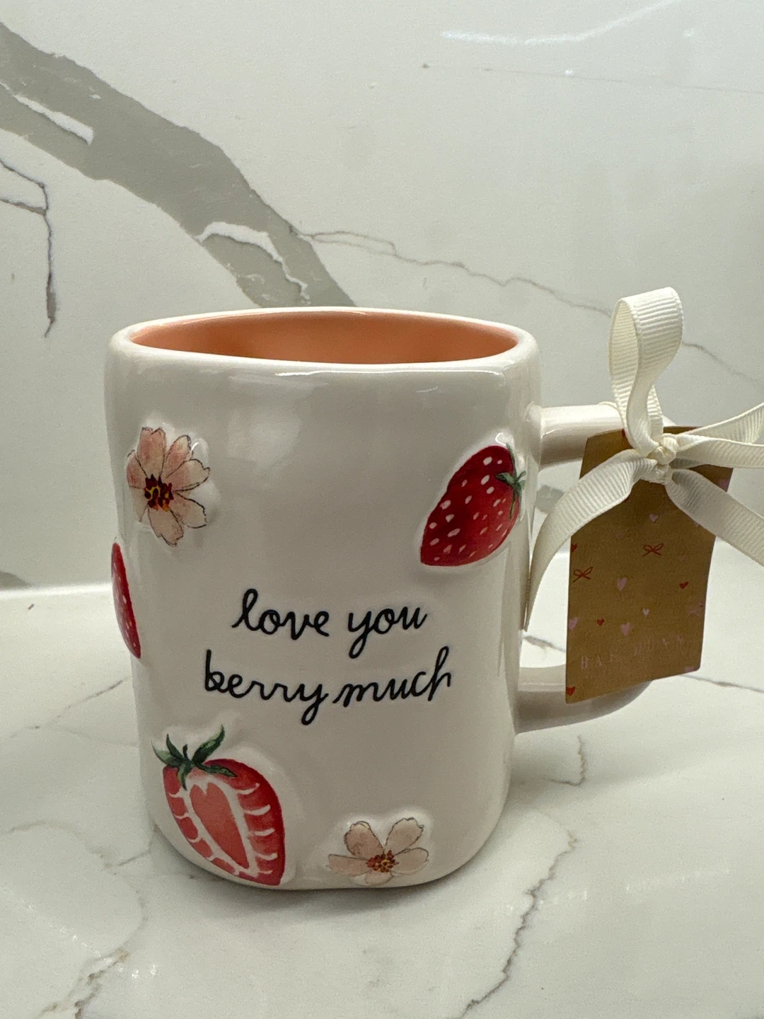 This Rae Dunn mug features a sweet "love you berry much" sentiment with strawberry and flower designs. It's perfect for gifting to someone special or for enjoying your morning coffee or tea. The inside is a vibrant coral colour.