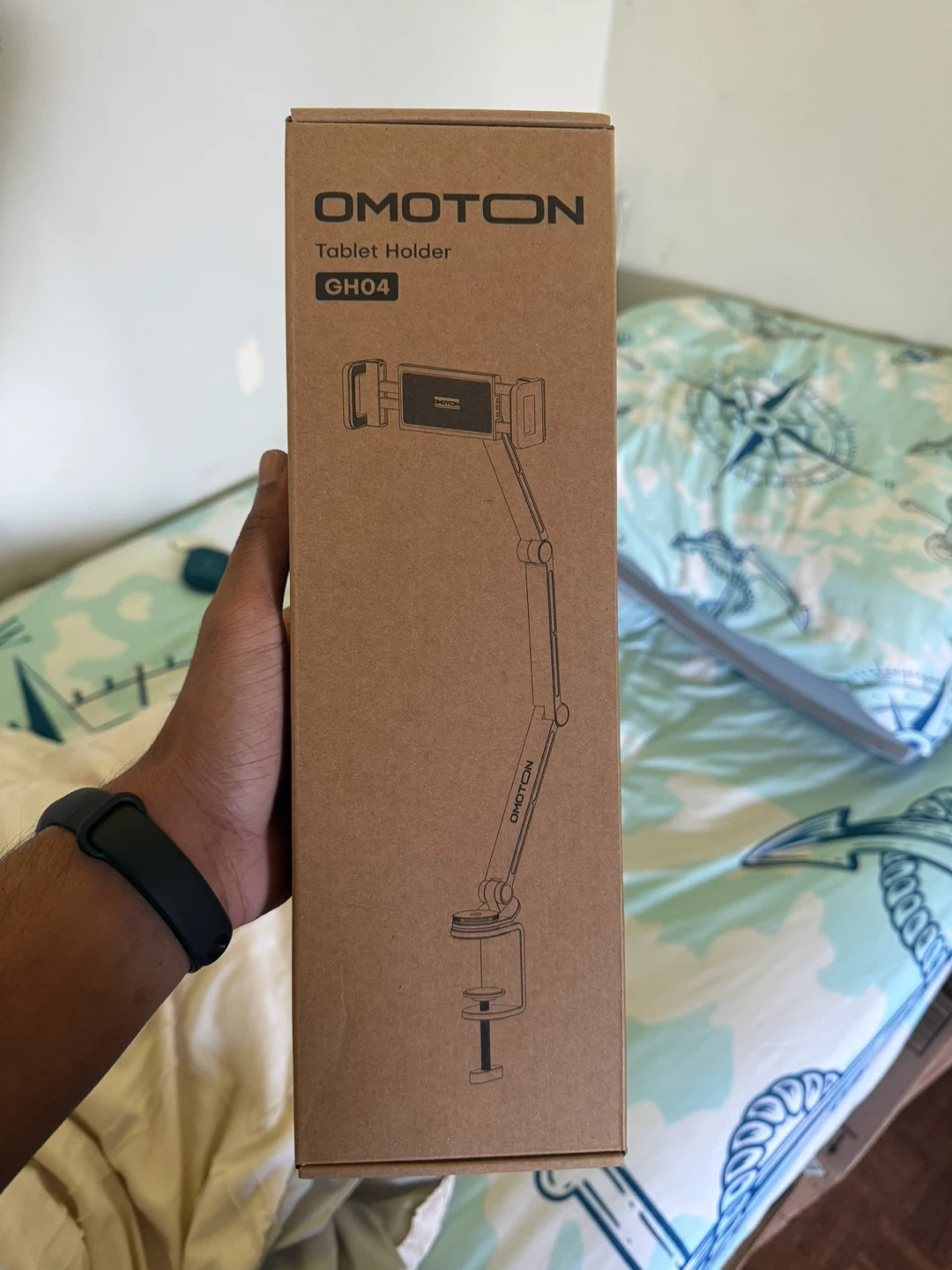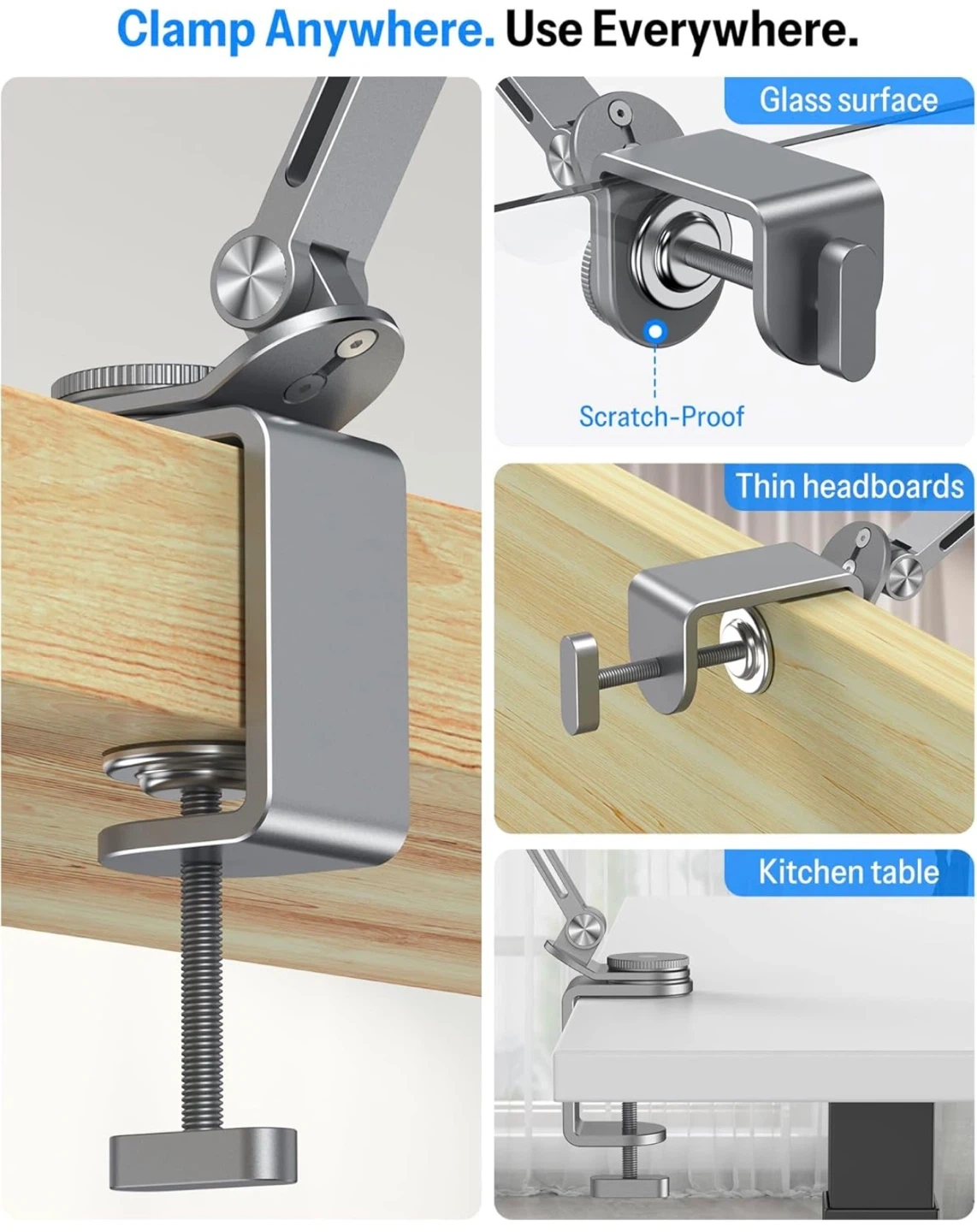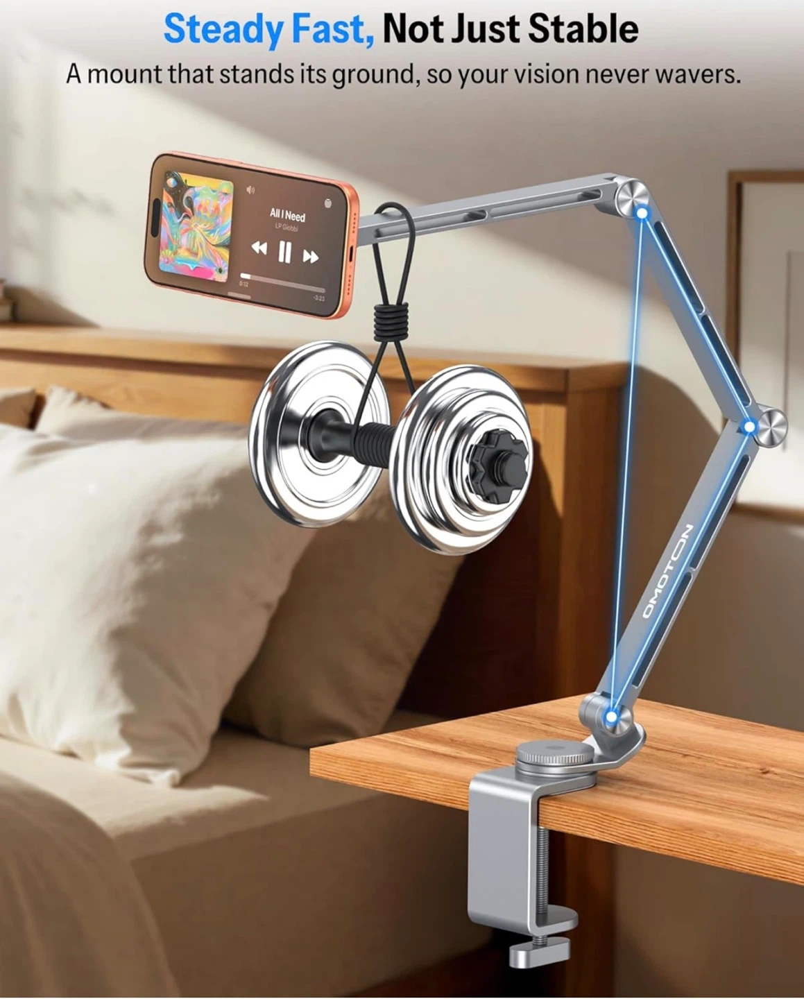 This is an OMOTON GH04 tablet holder with an adjustable aluminum arm. It features a large clamp for secure attachment to desks or tables. It's a versatile mount for phones and tablets up to 12.9 inches.