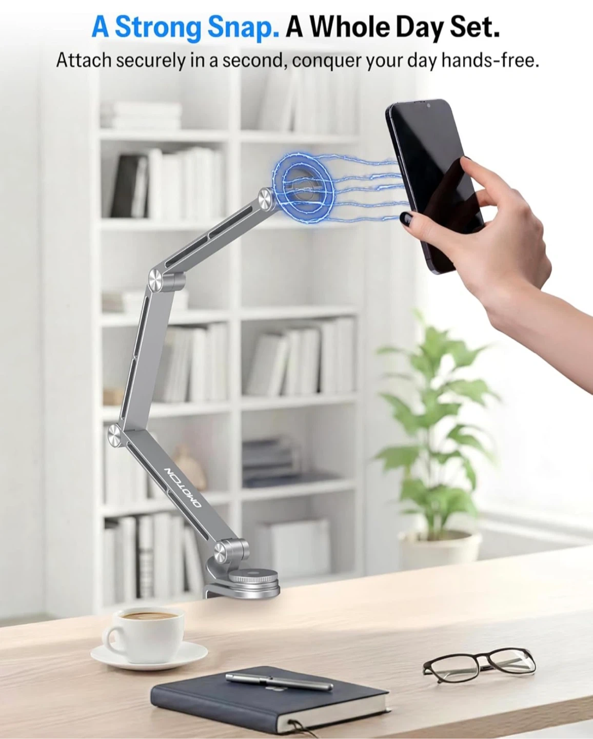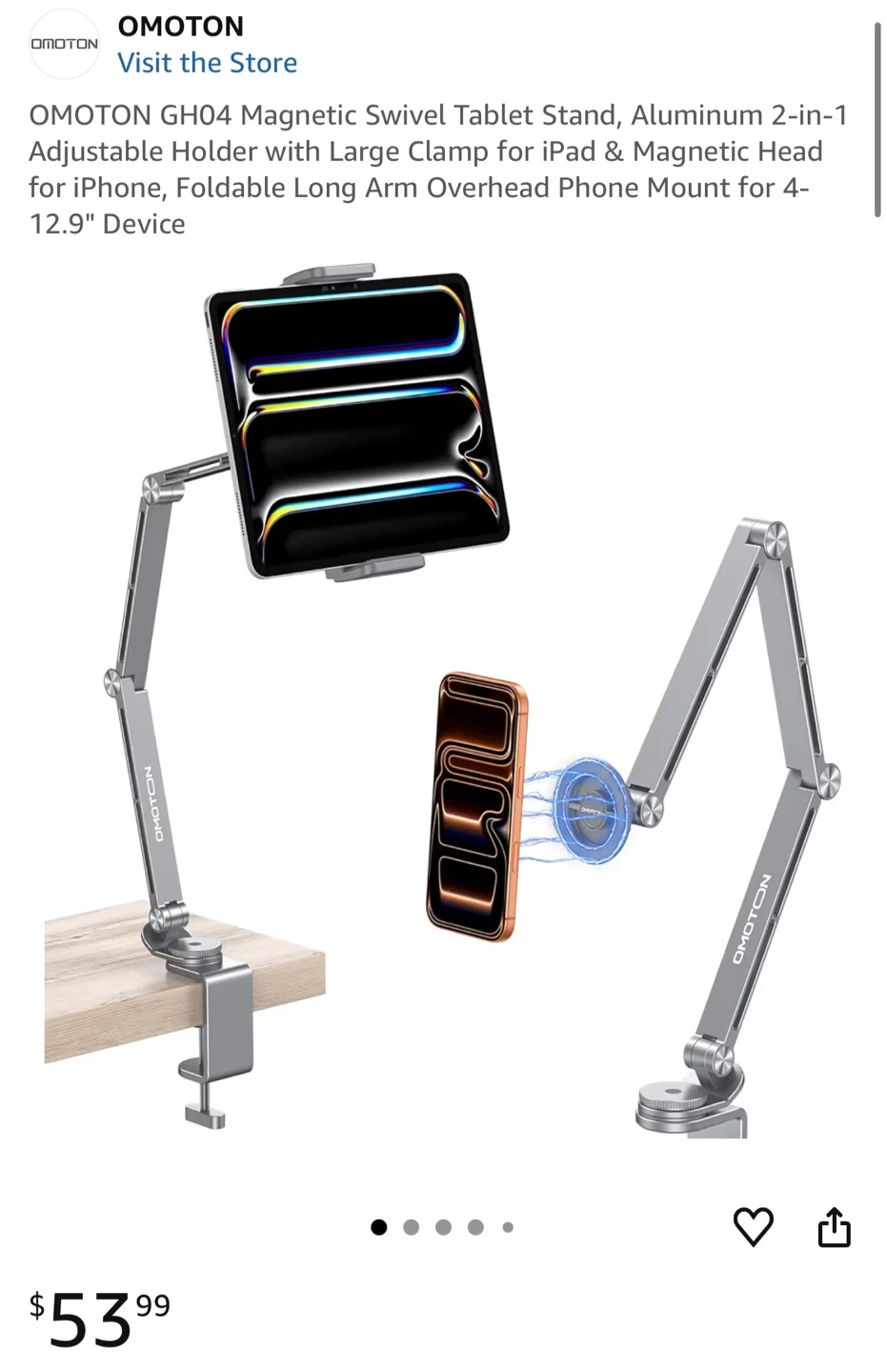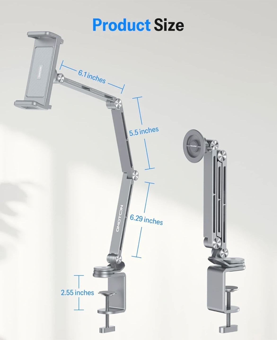 This is an OMOTON GH04 tablet holder with an adjustable aluminum arm. It features a large clamp for secure attachment to desks or tables. It's a versatile mount for phones and tablets up to 12.9 inches.