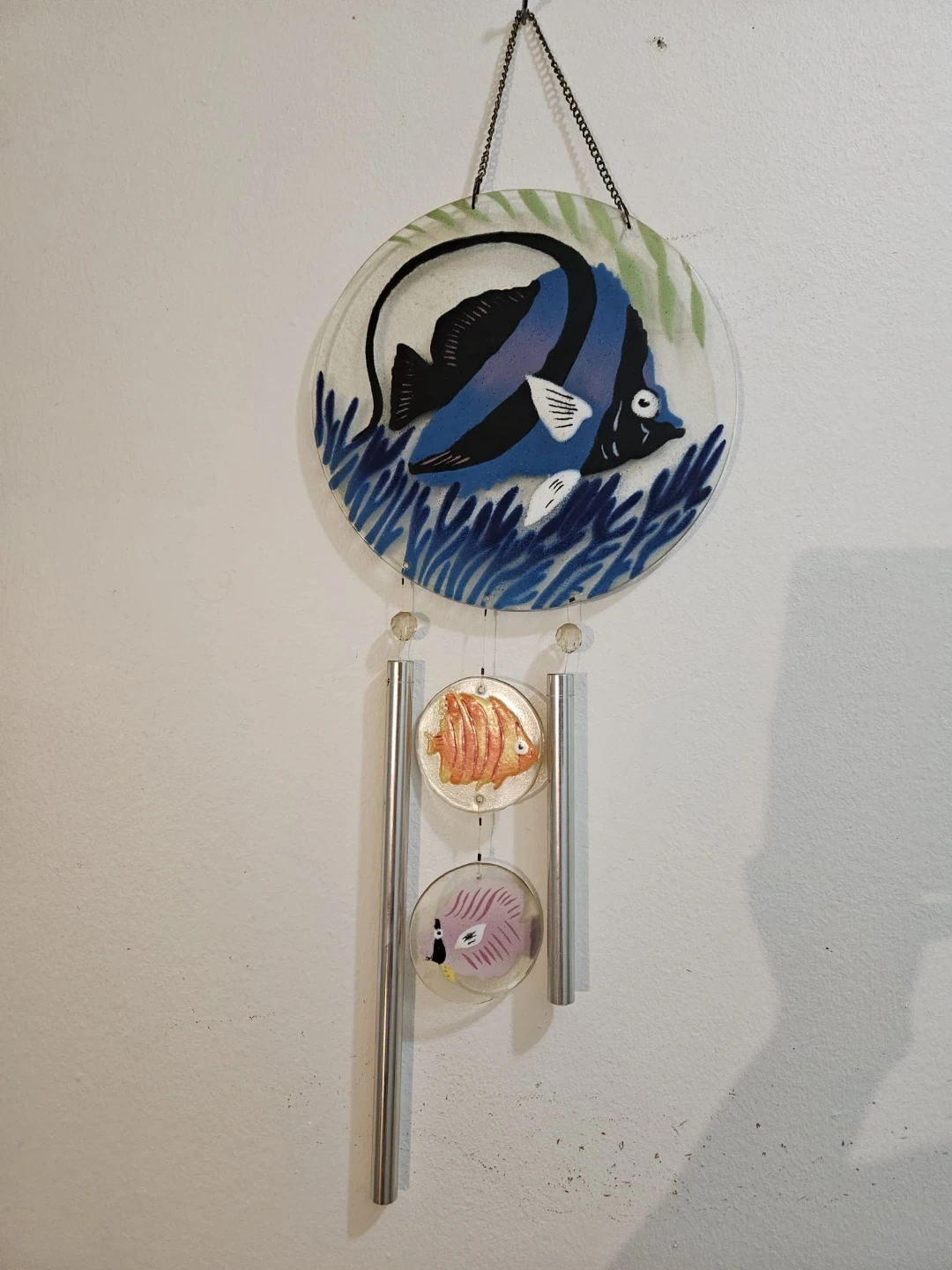 Cute fish themed wind chime! Features a blue and black fish at the top, with orange and pink fish below. The metal chimes add a gentle sound to any space