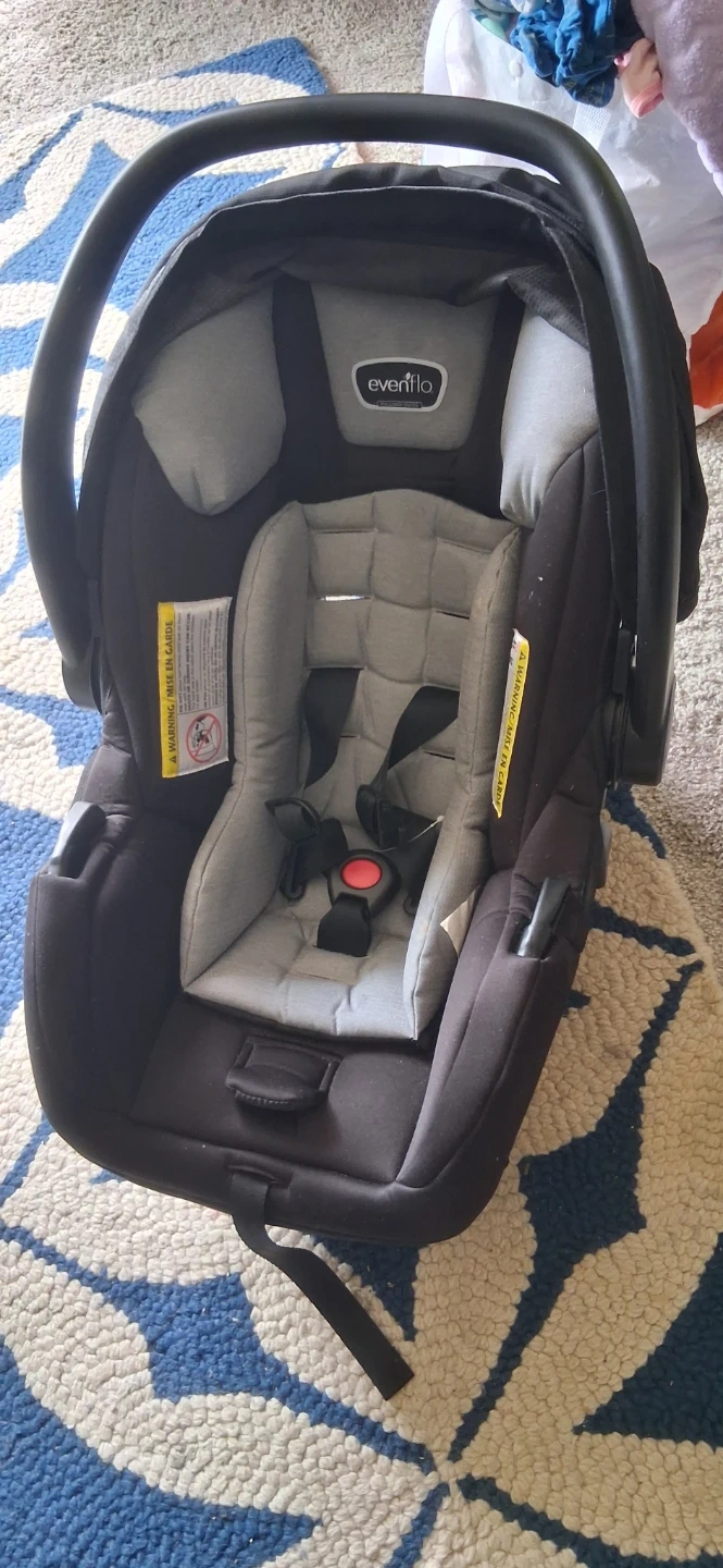 This is an Evenflo infant car seat. It has a 5-point harness system for safety. The grey and black fabric is easy to clean.