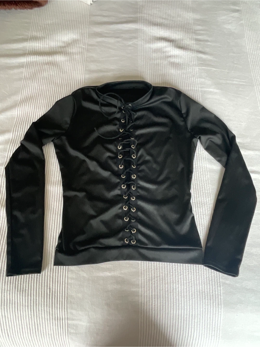 This is a black long-sleeve top with a lace-up front closure. It features grommets and a tie for a custom fit. The material appears to be a stretchy, smooth fabric.