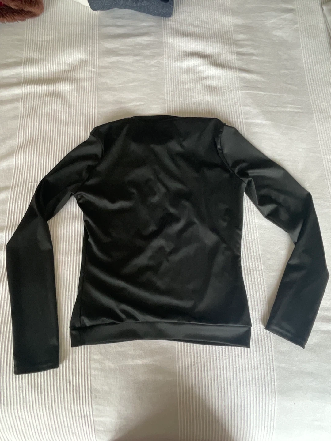 This is a black long-sleeve top with a lace-up front closure. It features grommets and a tie for a custom fit. The material appears to be a stretchy, smooth fabric.