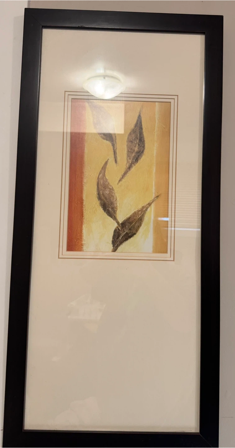 Framed leaf print wall art with a black frame. Neutral tones in brown, yellow, and orange. Simple, modern look and a nice addition to any room. Good condition.