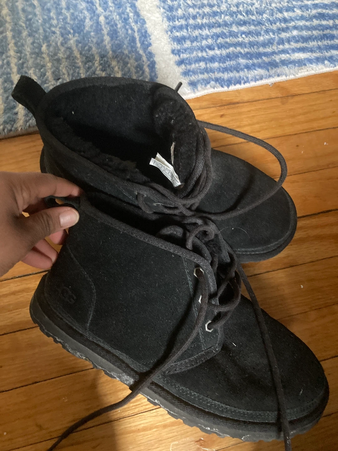These are black UGG Australia boots made with suede material. They feature a lace-up closure for a secure fit. These boots are designed for warmth and comfort, perfect for cooler weather. Size 7.