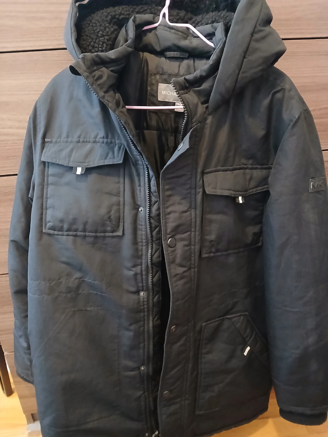 This is a black Michael Kors winter parka jacket. It features a hooded design with a sherpa-lined hood. Two chest pockets and one
