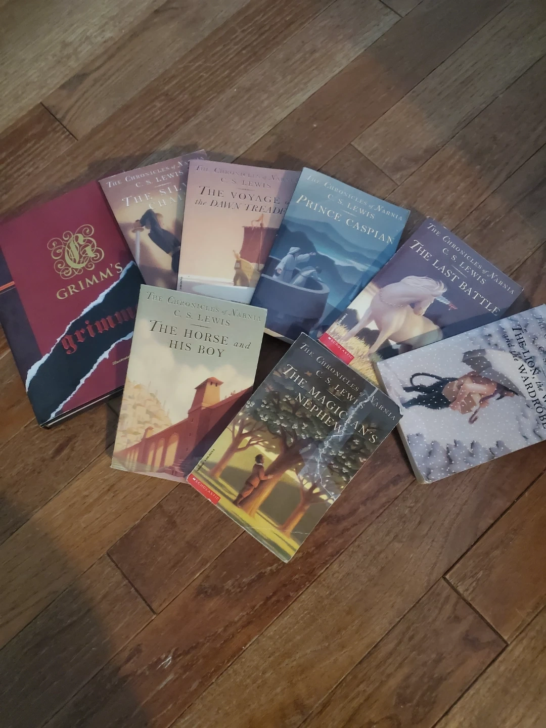 A collection of C.S. Lewis's classic fantasy series, The Chronicles of Narnia. Includes titles like The Lion, the Witch and the Wardrobe, Prince Caspian, and The Magician's Nephew, along with Grimm's tales. These books are in VERY GOOD used condition
