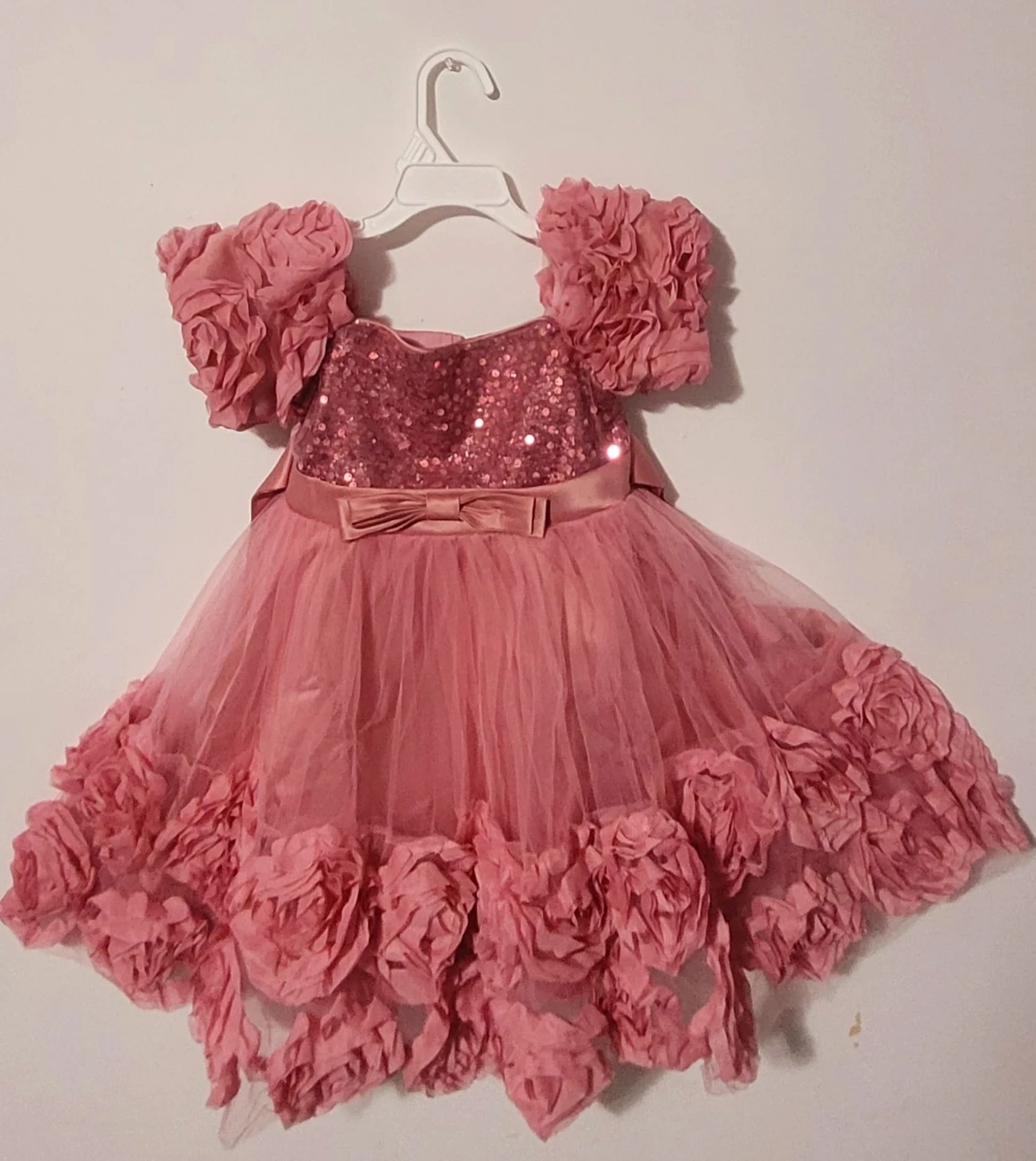 Adorable pink baby dress with sequin bodice and fluffy rose-petal skirt. It has puff sleeves and a satin bow accent. Perfect for special occasions or photoshoots!