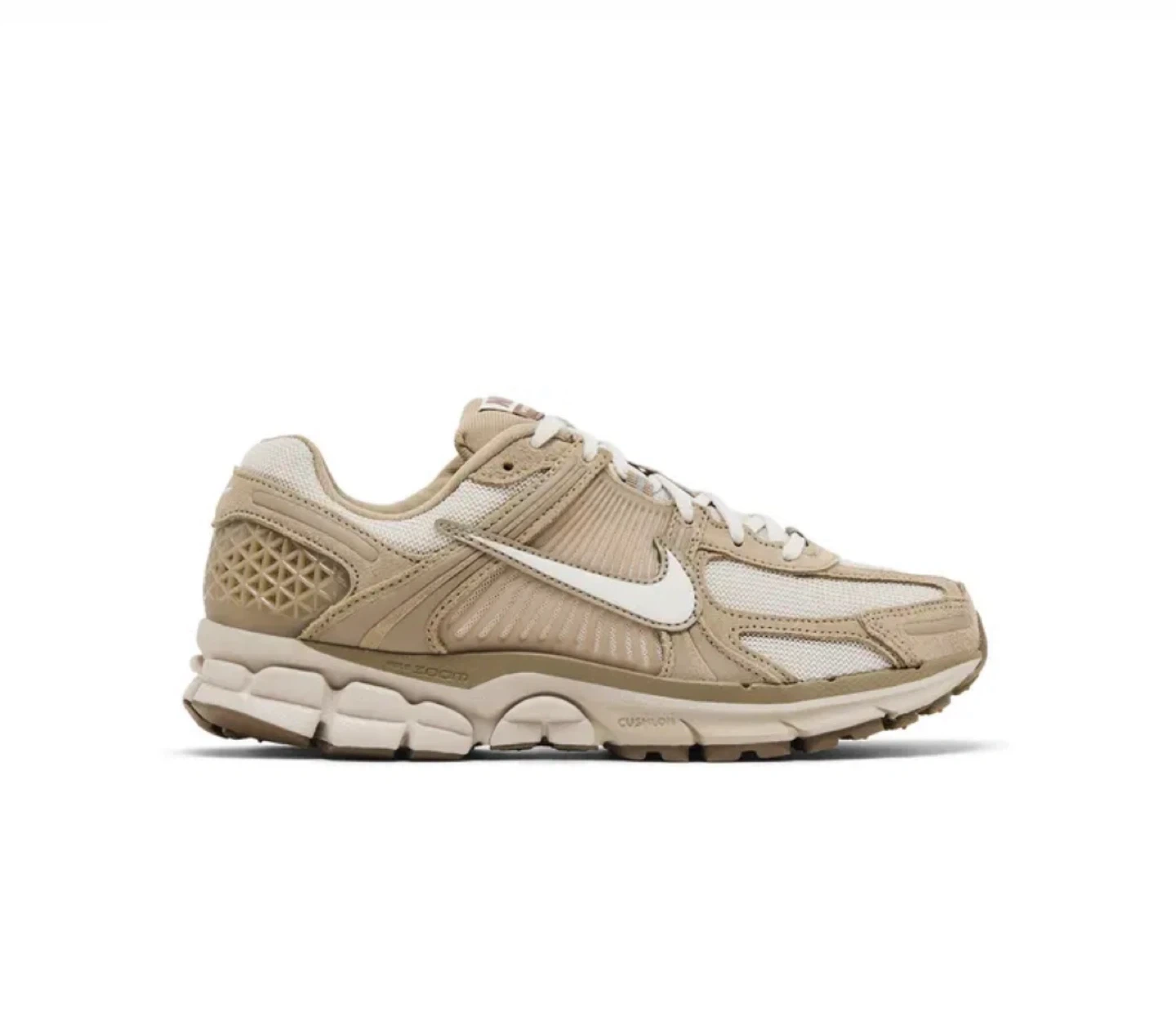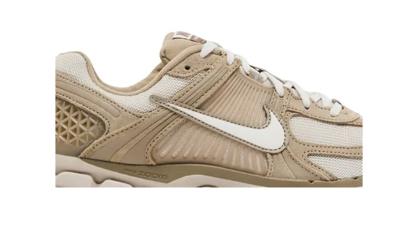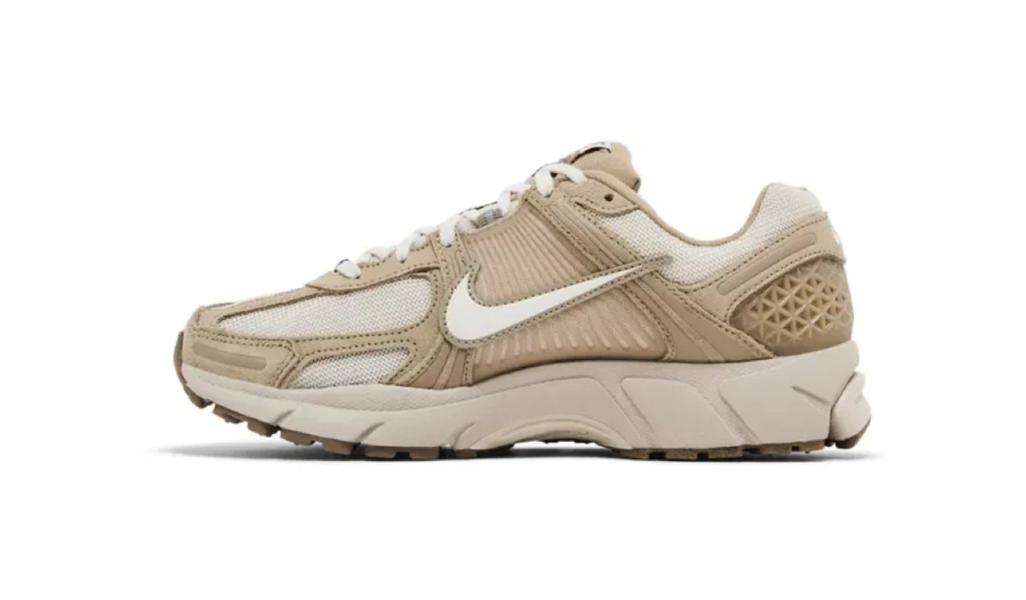 These Nike Zoom Vomero 5 sneakers come in a tan and white colourway. Features a breathable mesh upper with supportive overlays and Zoom Air cushioning for comfort. Ideal for everyday wear.