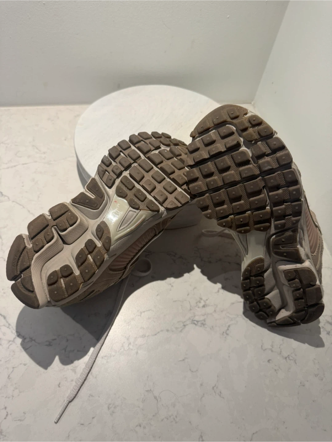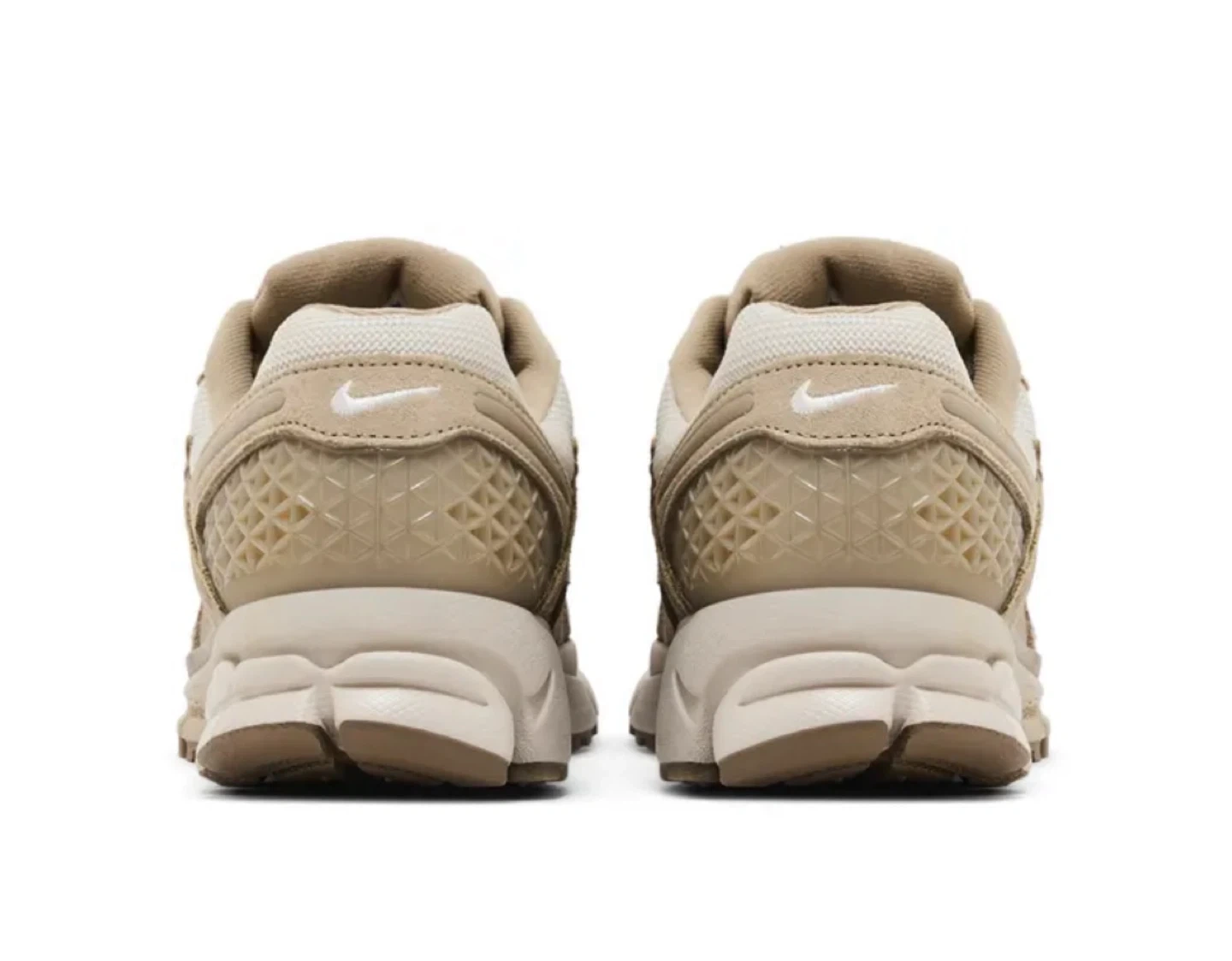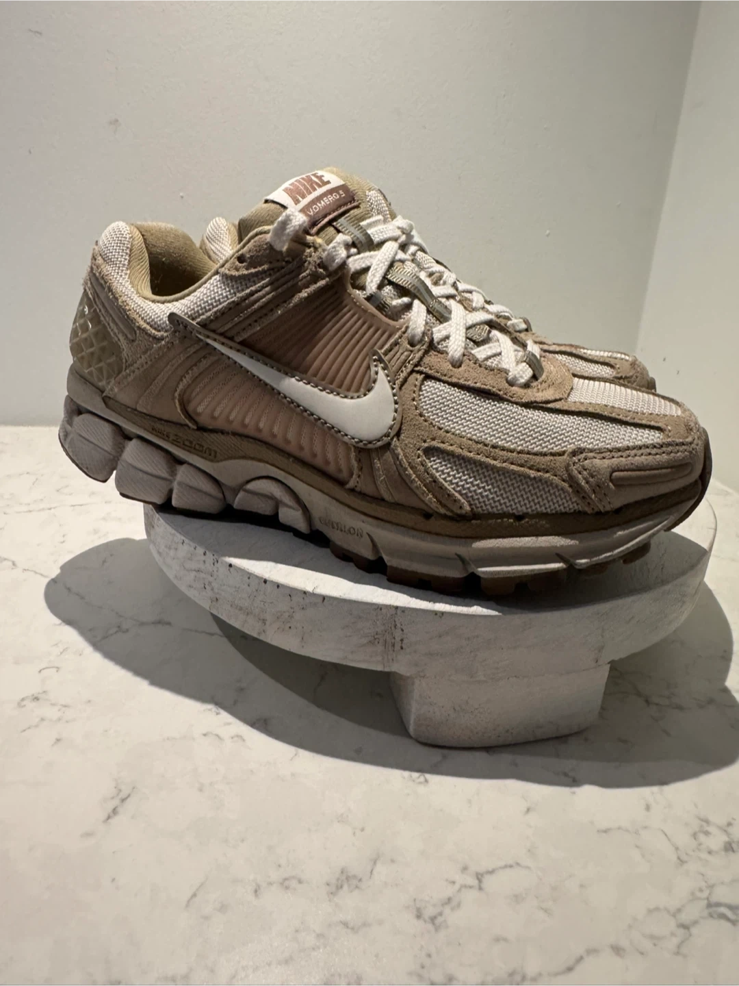 These Nike Zoom Vomero 5 sneakers come in a tan and white colourway. Features a breathable mesh upper with supportive overlays and Zoom Air cushioning for comfort. Ideal for everyday wear.