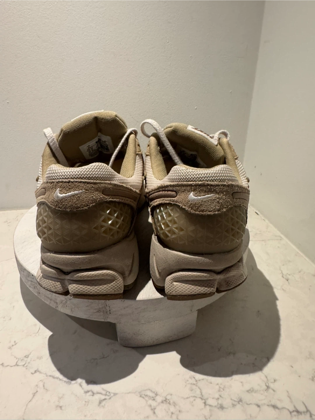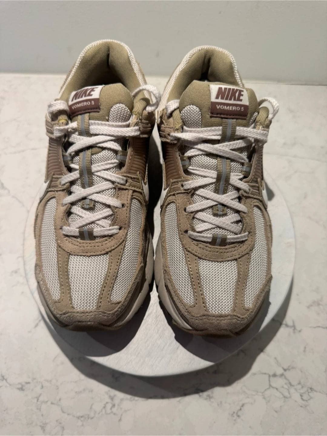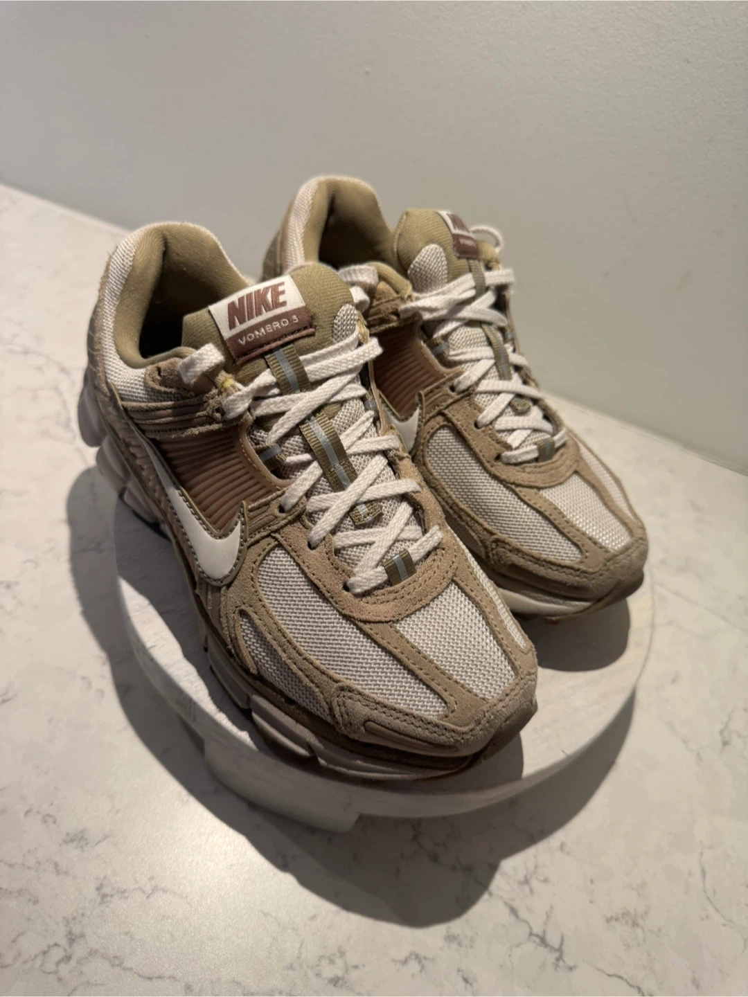 These Nike Zoom Vomero 5 sneakers come in a tan and white colourway. Features a breathable mesh upper with supportive overlays and Zoom Air cushioning for comfort. Ideal for everyday wear.