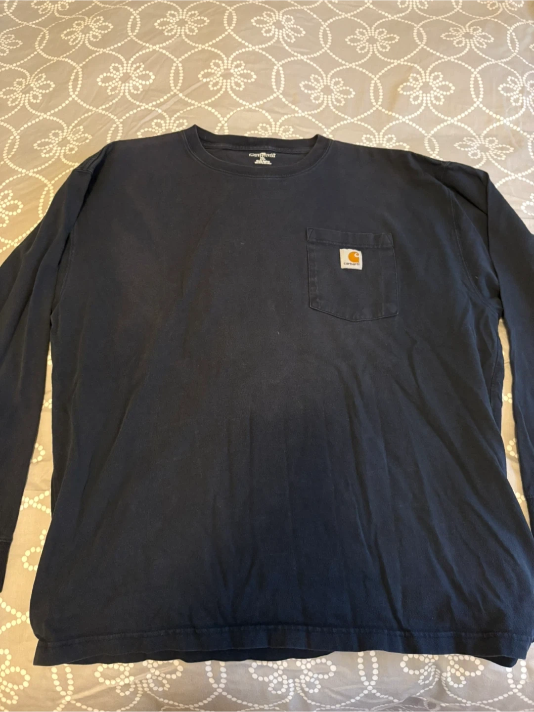 Selling a Carhartt long-sleeve shirt in size XL! It's a comfy, durable shirt made from 100% cotton and features a pocket on the chest. The shirt is a nice navy blue colour, perfect for everyday wear!