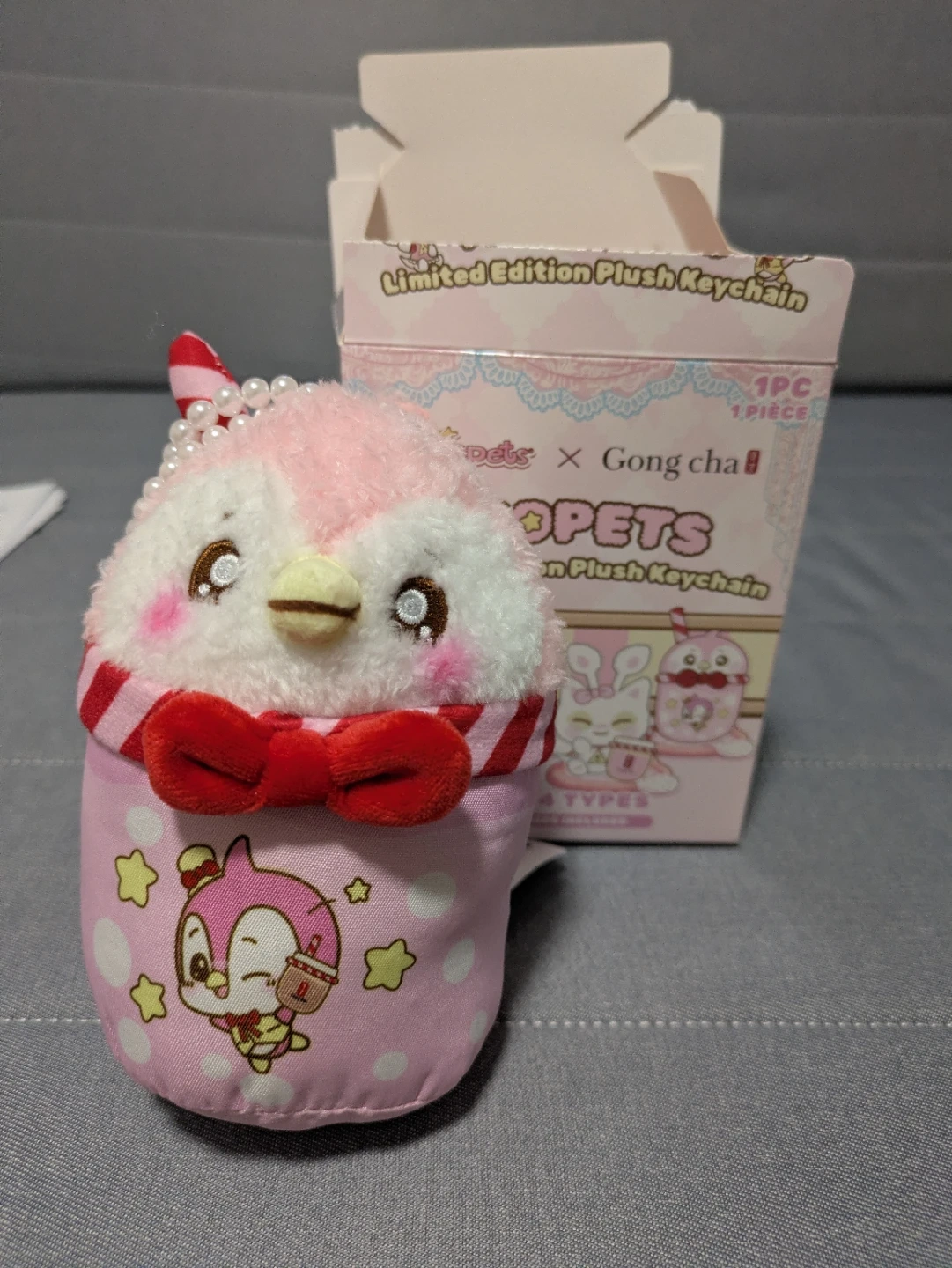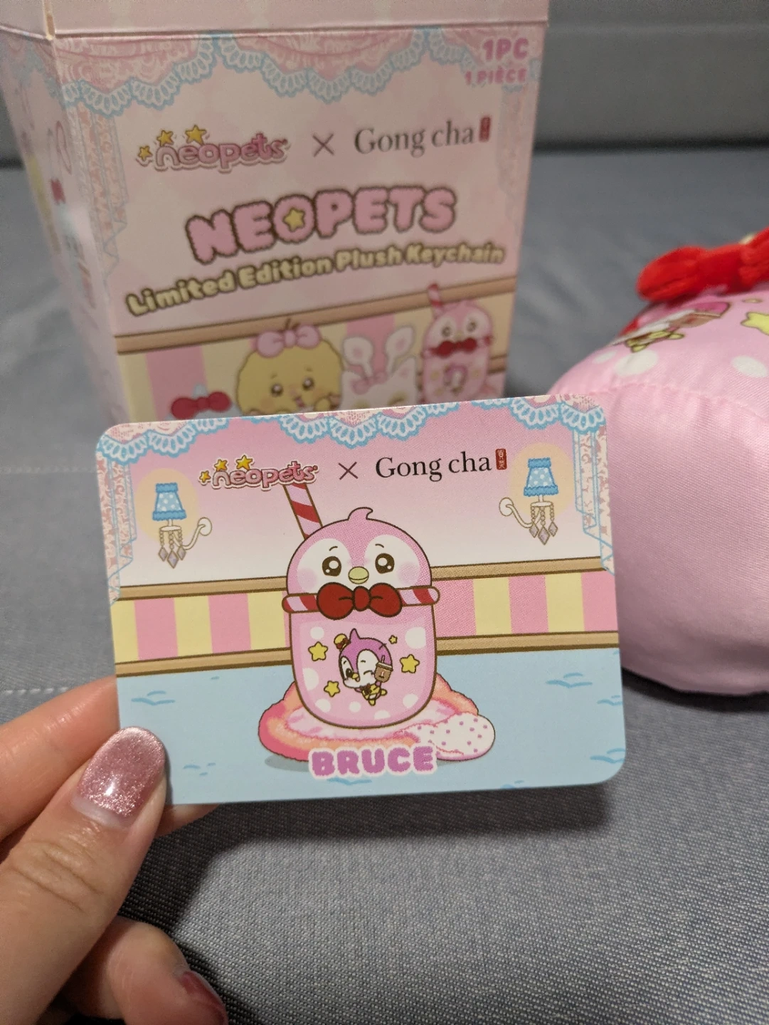 Limited edition Neopets x Gong Cha keychain collab, strawberry Bruce variation.