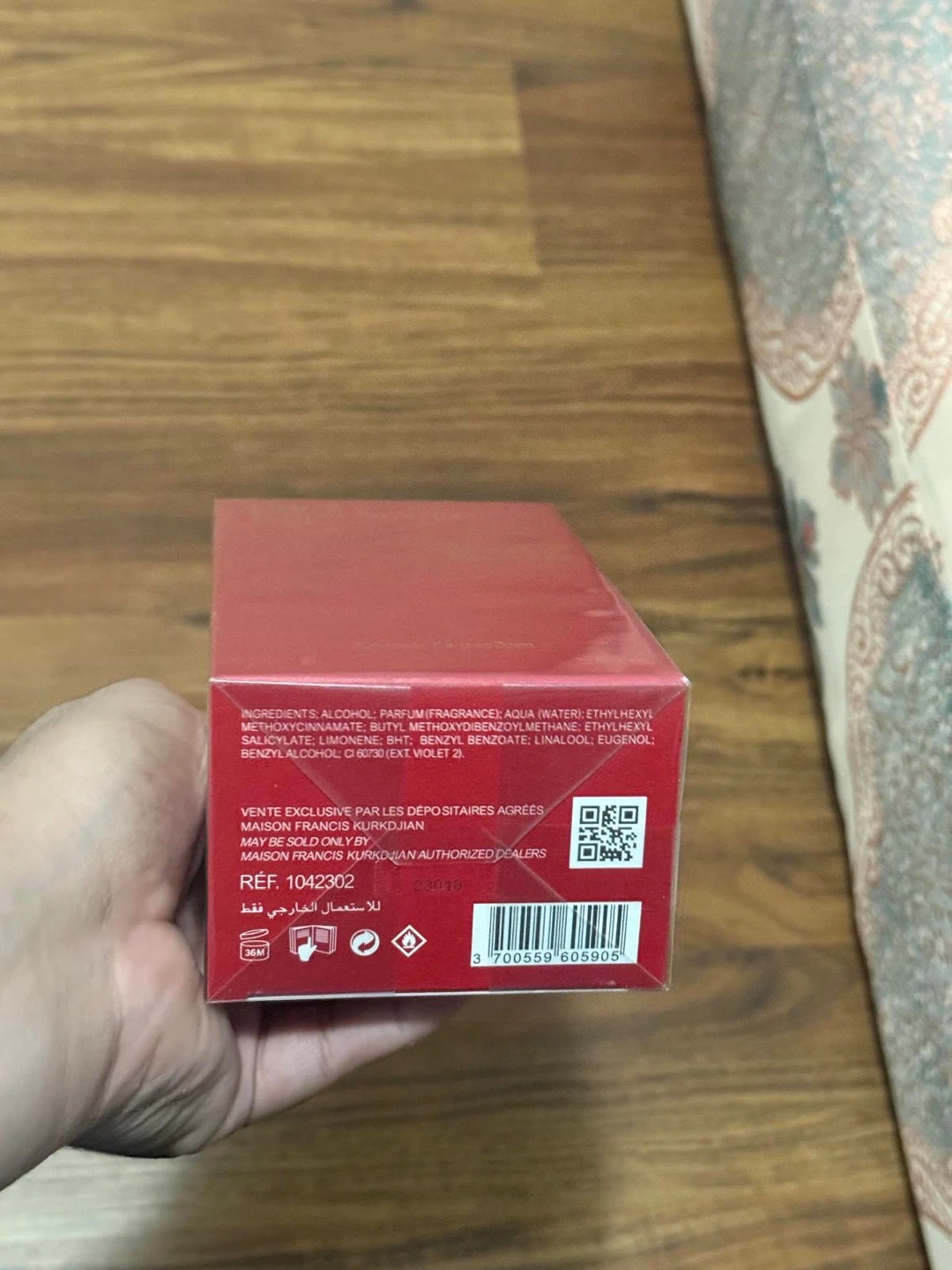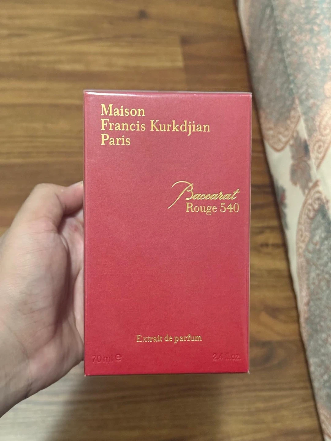 This is a bottle of Maison Francis Kurkdjian Baccarat Rouge 540 Extrait de parfum. It's a 70 ml bottle with a 2.4 fl. oz. volume. The fragrance contains alcohol, parfum, water, and other key ingredients.