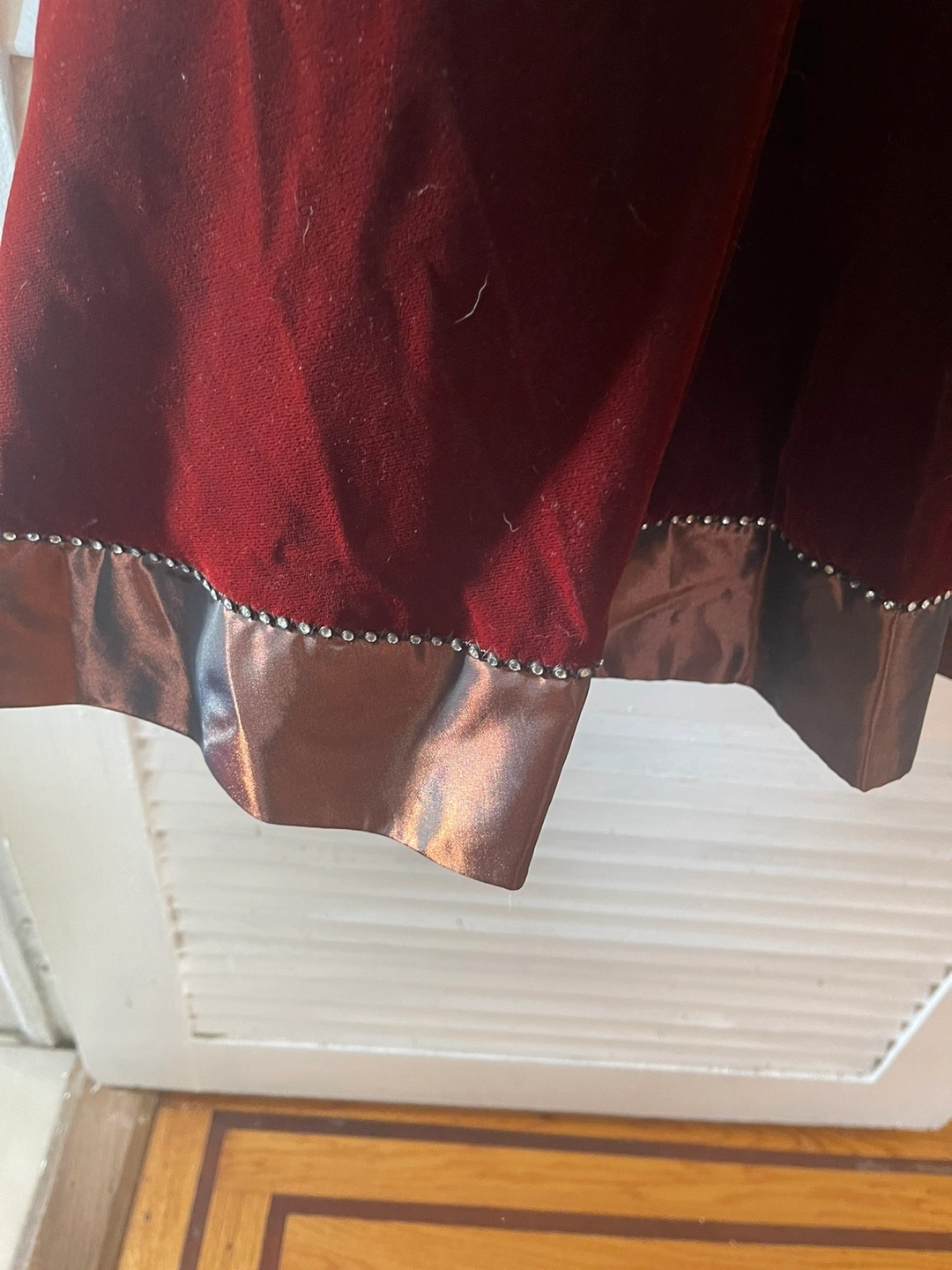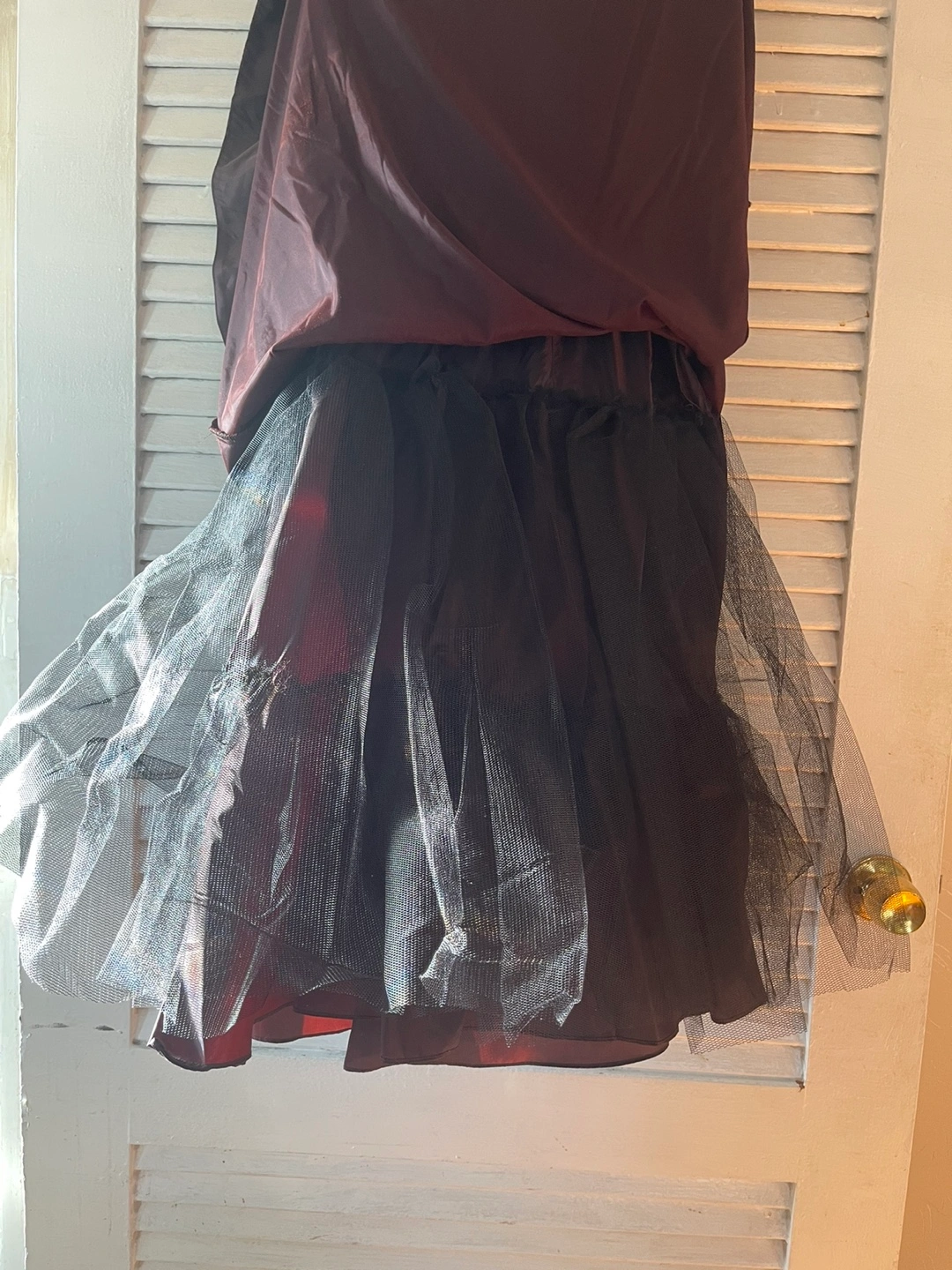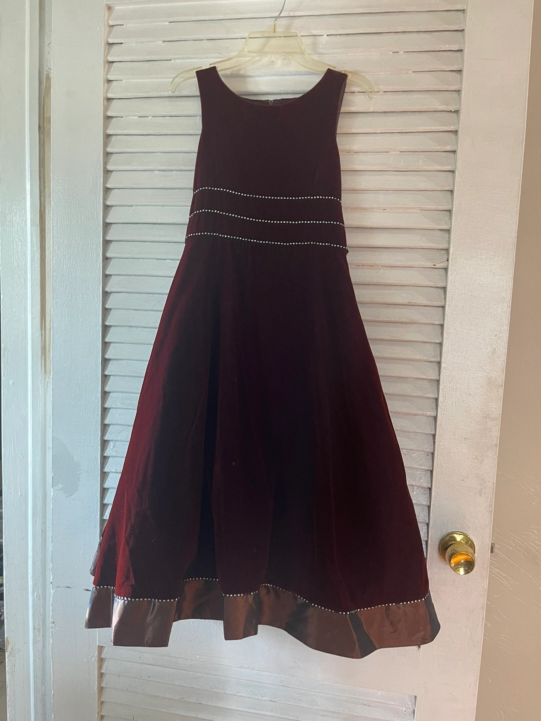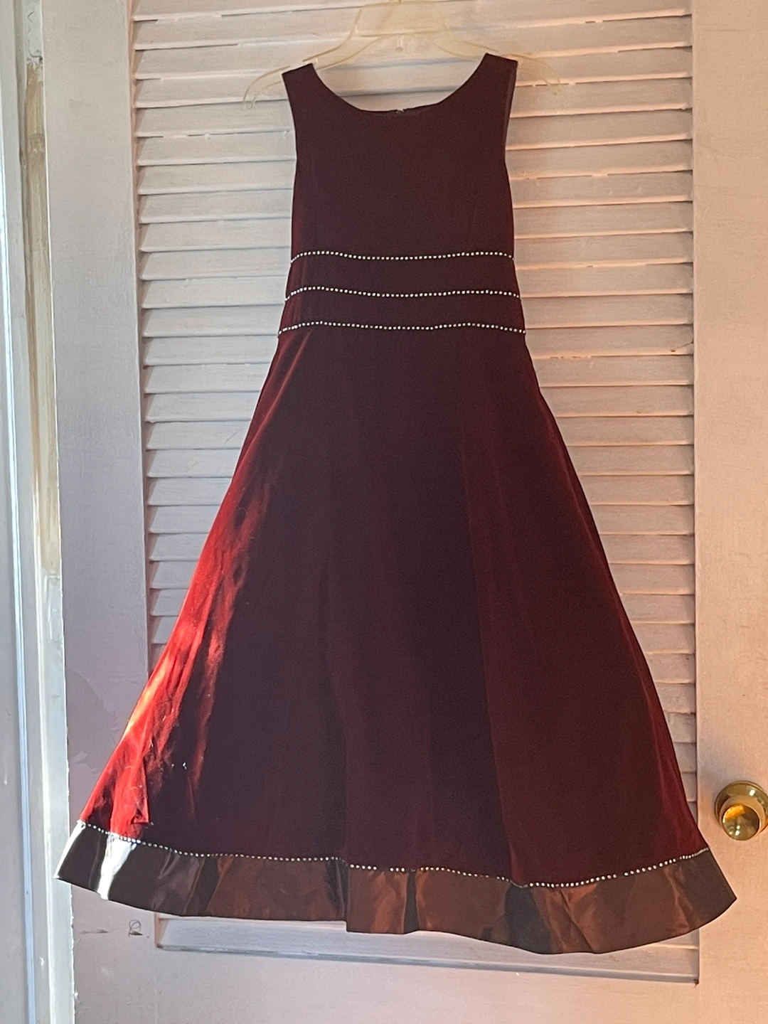 Burgundy velvet dress with a black underskirt and rhinestone accents. Sleeveless and floor length. Size 12 #ThriftyPicks