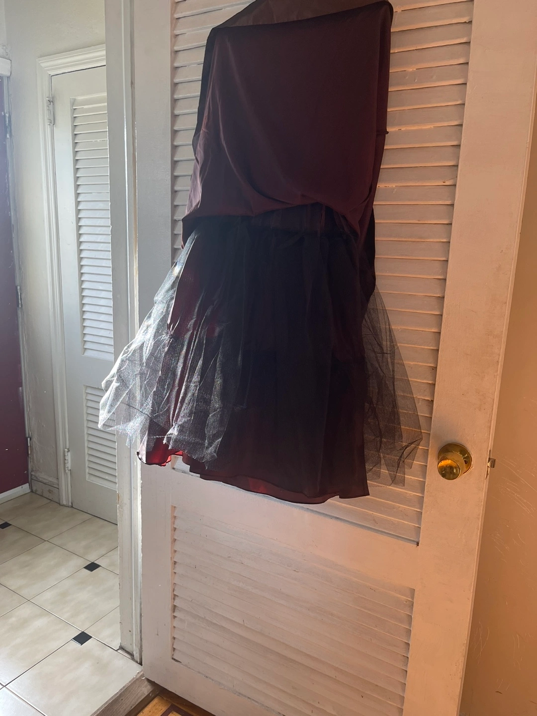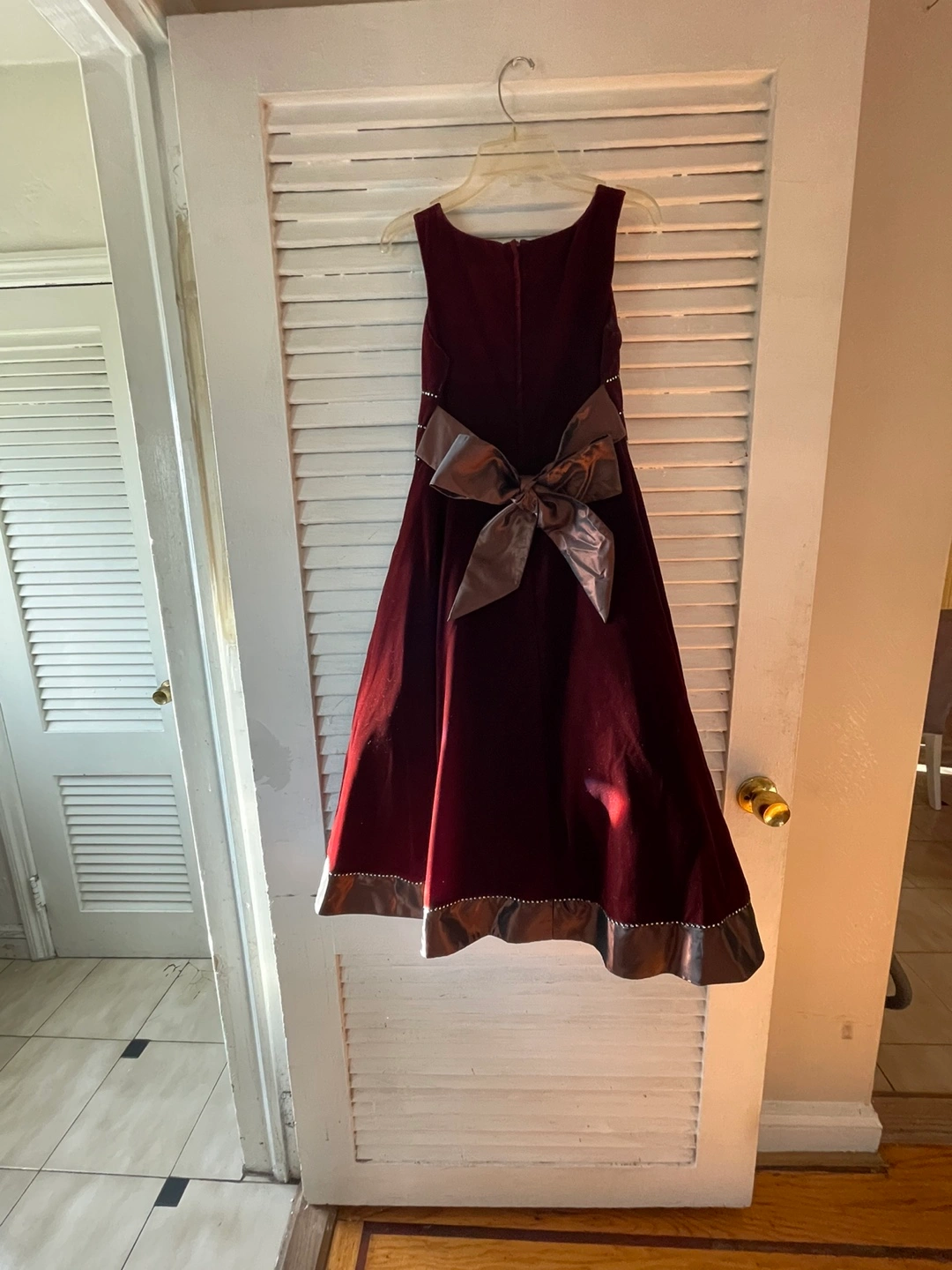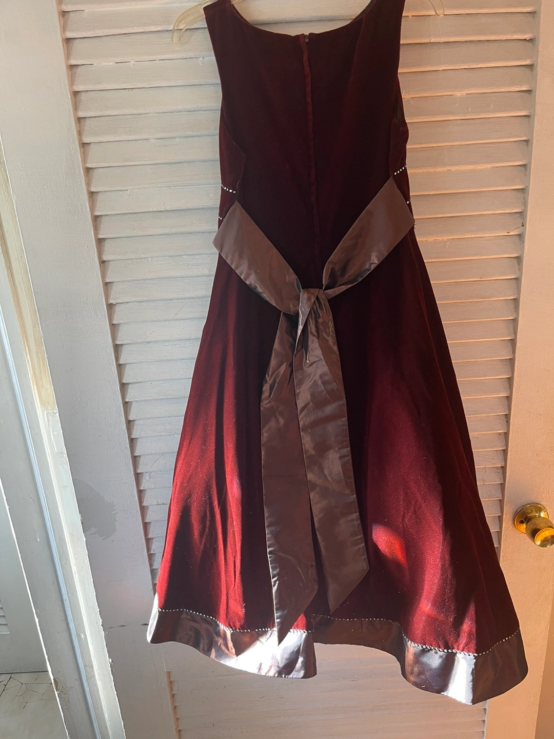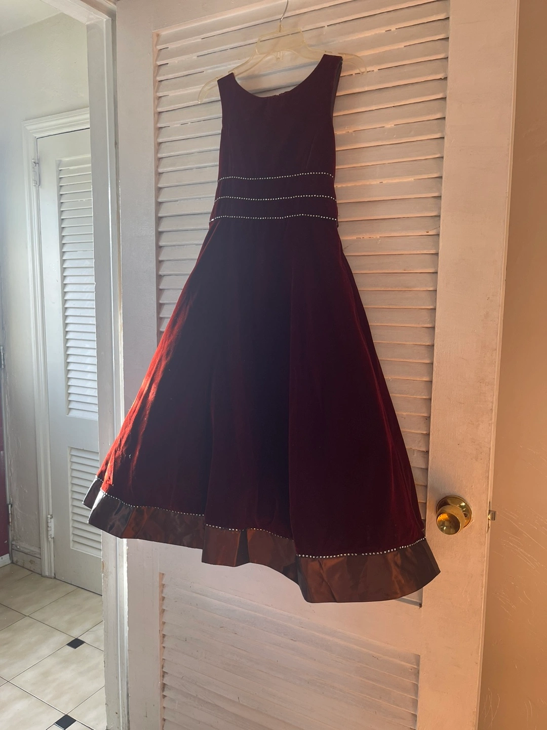 Burgundy velvet dress with a black underskirt and rhinestone accents. Sleeveless and floor length. Size 12 #ThriftyPicks