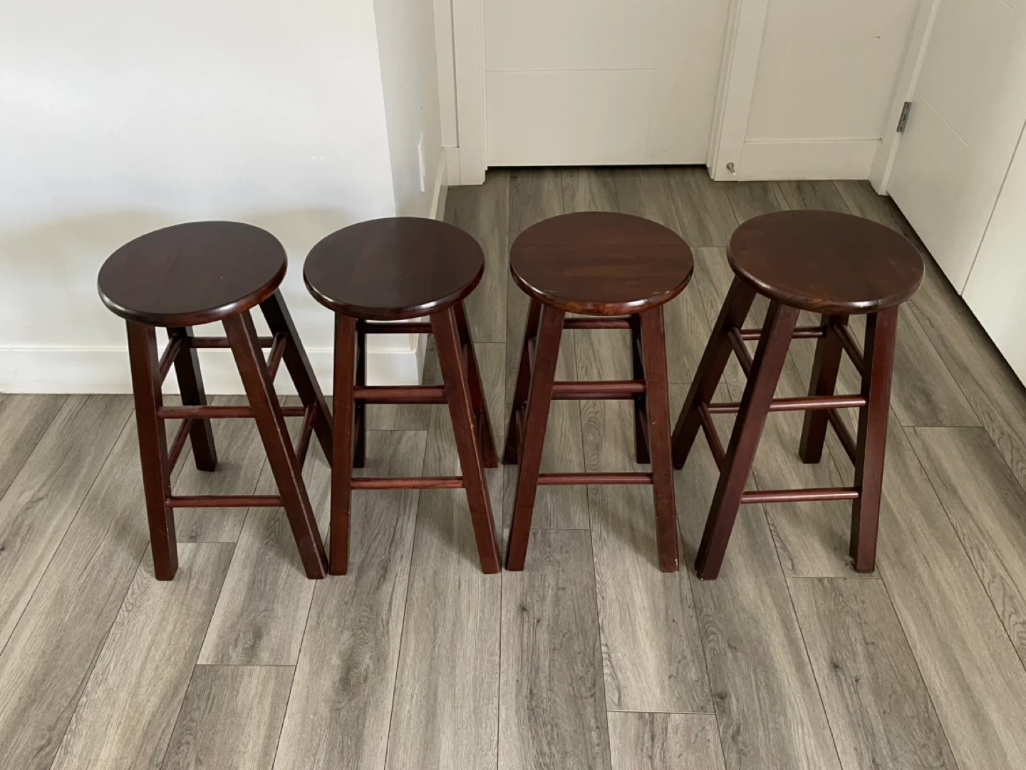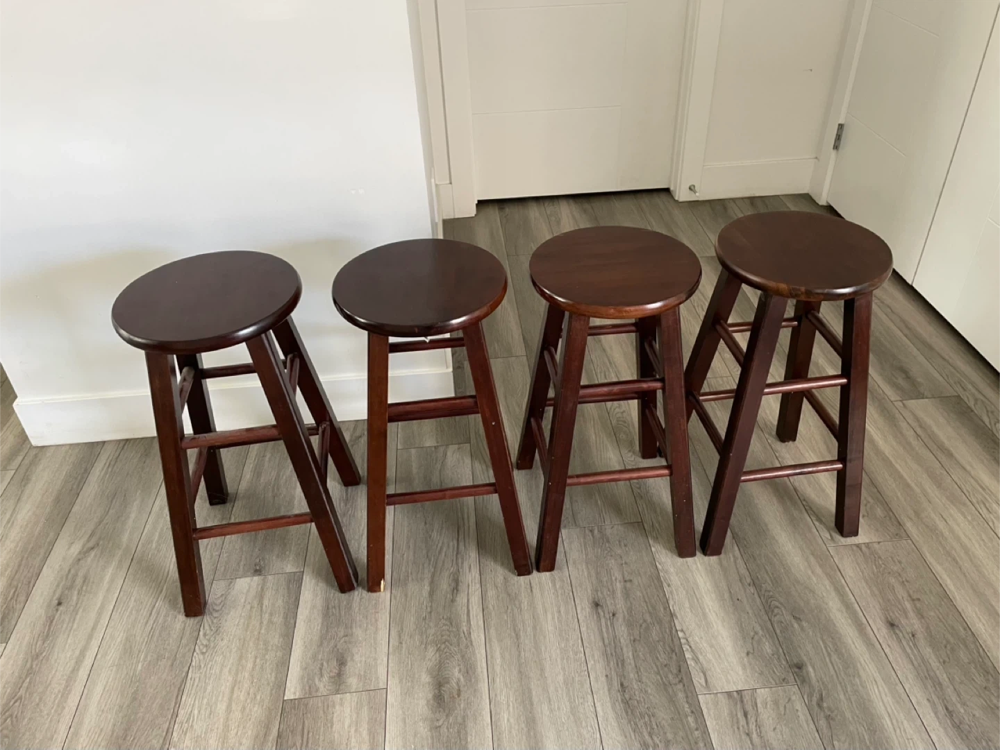($100 For All) Set of 4 Wooden Bar Stools. Brown In Color & Classic Design. In Good Condition & Perfect For Your Kitchen Island or Bar Area.
