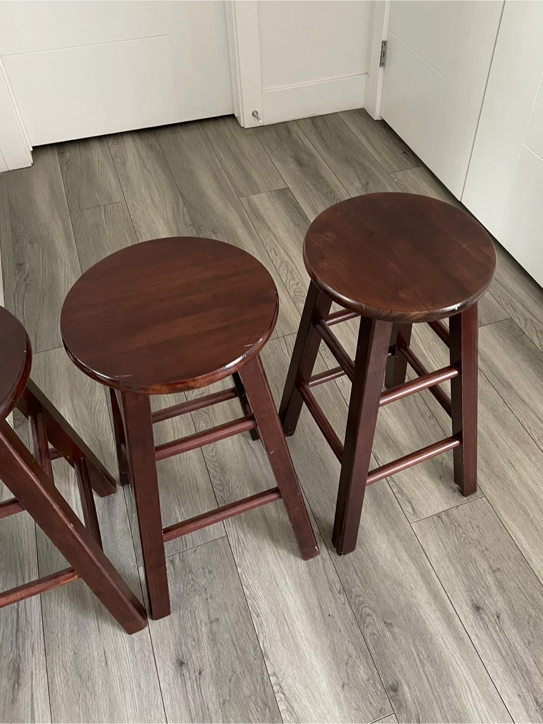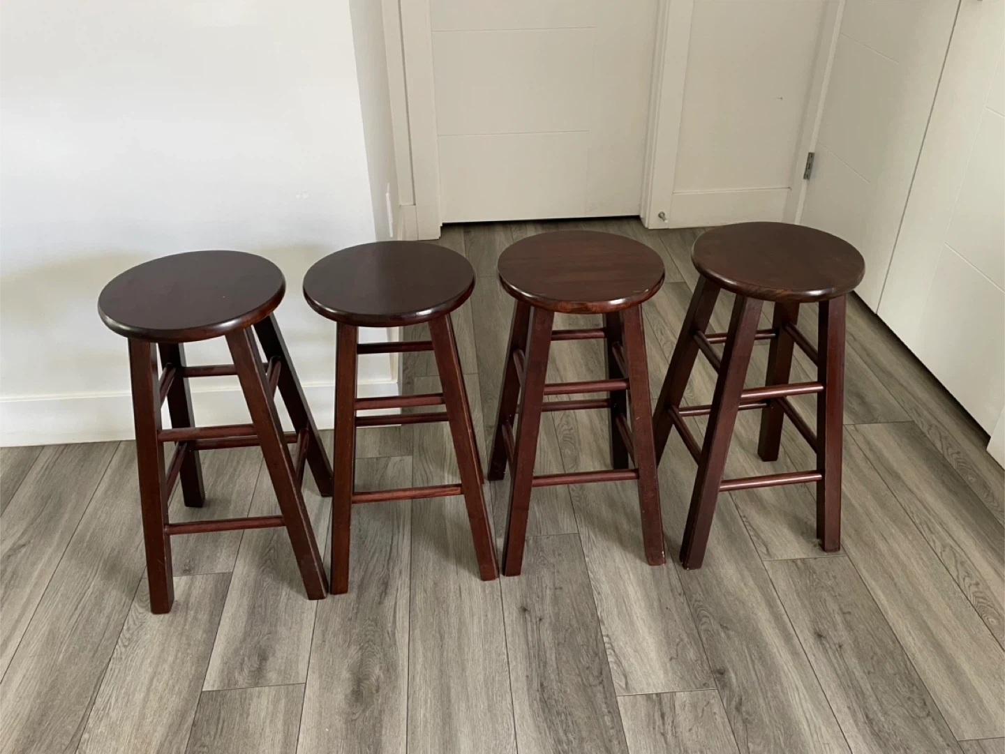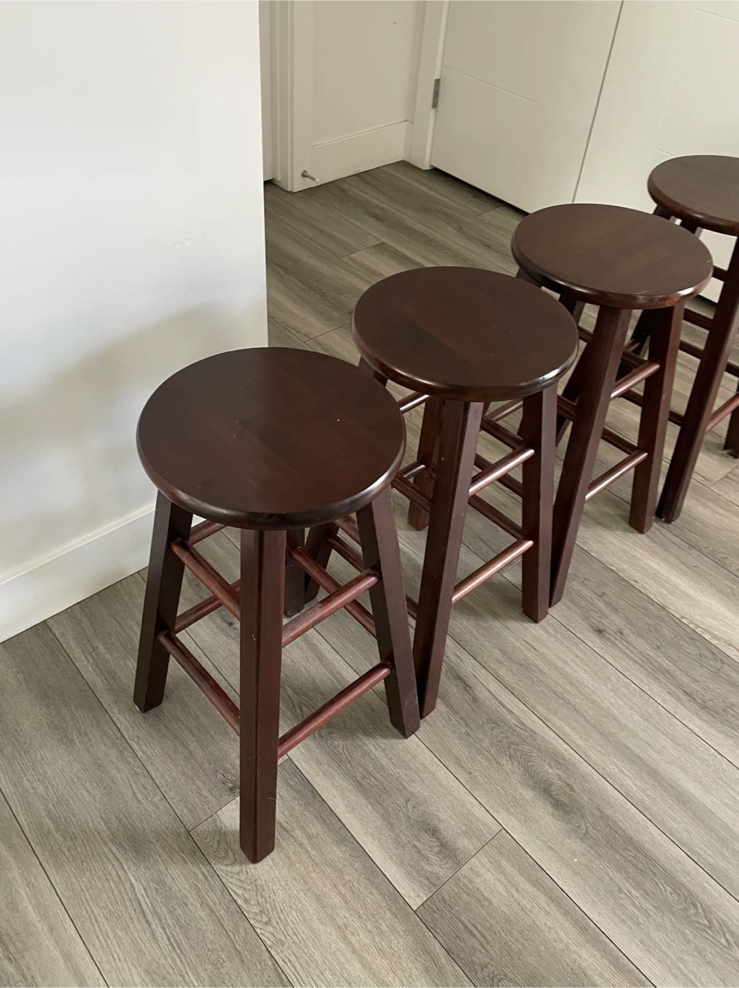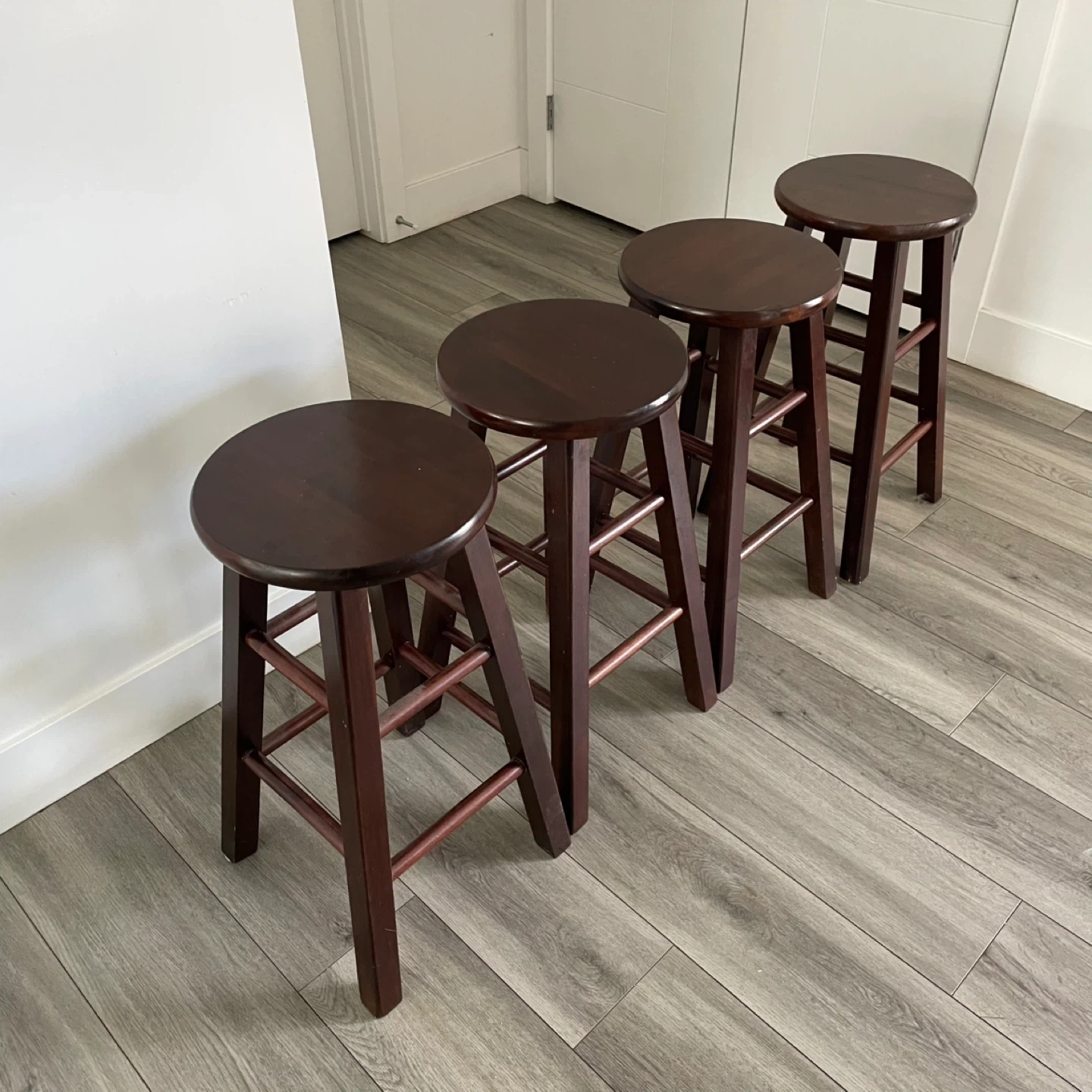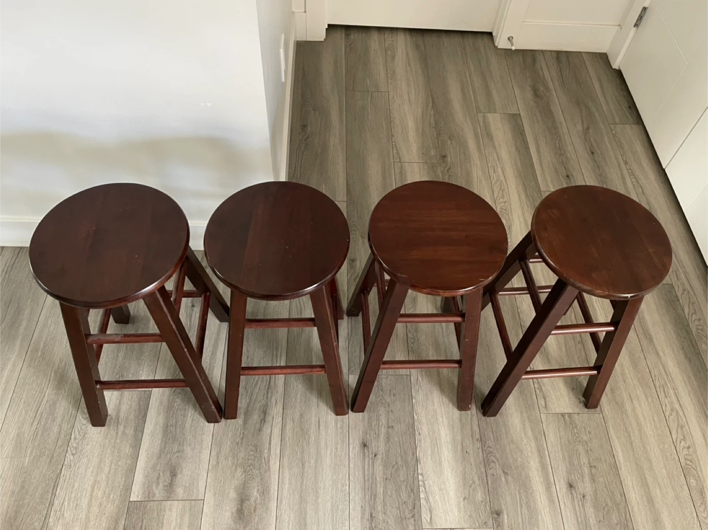 ($100 For All) Set of 4 Wooden Bar Stools. Brown In Color & Classic Design. In Good Condition & Perfect For Your Kitchen Island or Bar Area.