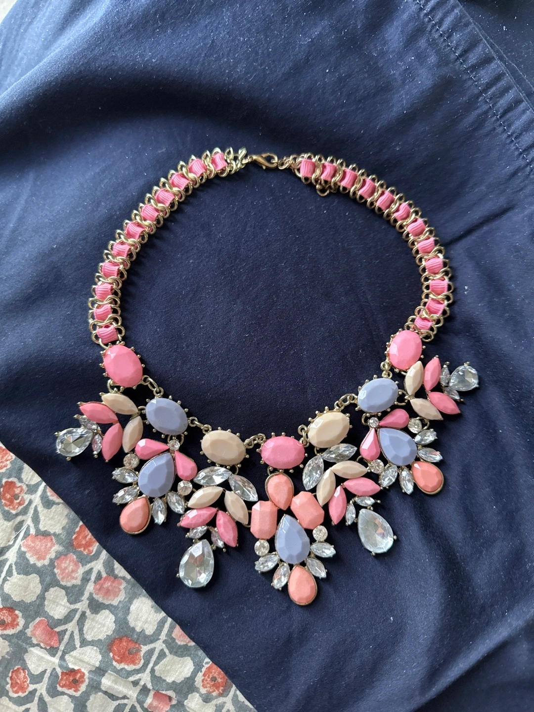 Gorgeous statement necklace. Features pastel pink, purple, and beige stones. Gold-tone chain and clasp. Perfect for adding a touch of elegance to any outfit.