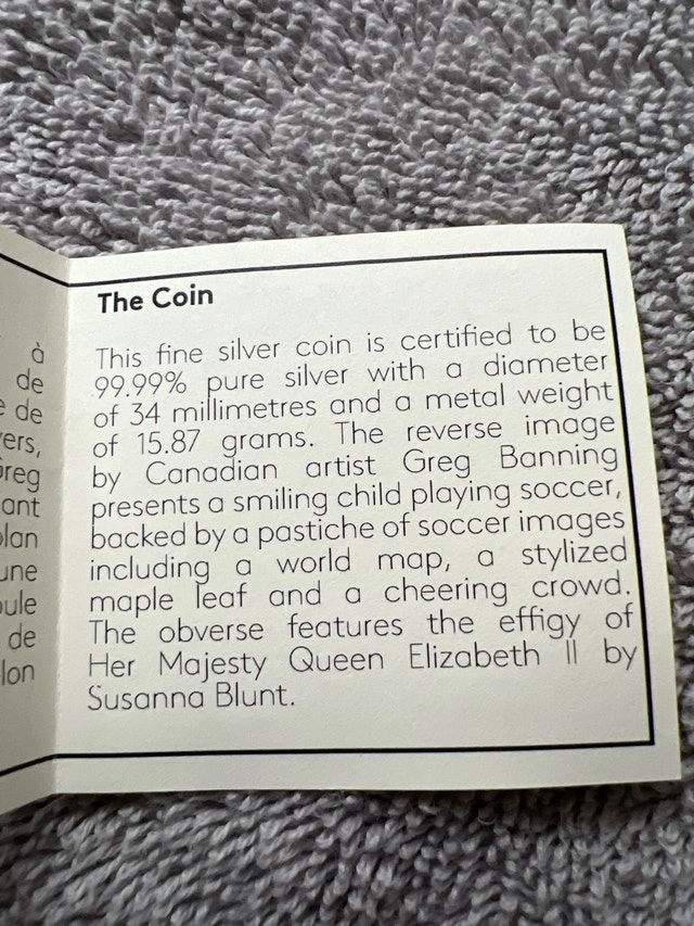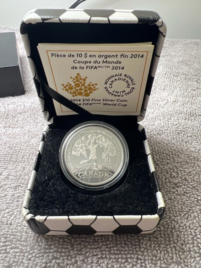 Here's a 2014 FIFA World Cup fine silver $10 coin, a fantastic collectible featuring a soccer theme! Specifications: * Composition: 99.99% Pure Silver * Diameter: 34 mm * Weight: 15.87 grams * Obverse: Effigy of Her Majesty Queen Elizabeth II by Susanna Blunt * Reverse: A child playing soccer, designed by Greg Banning. Condition: Used - Good. For Sale By: Owner. Cash accepted.
