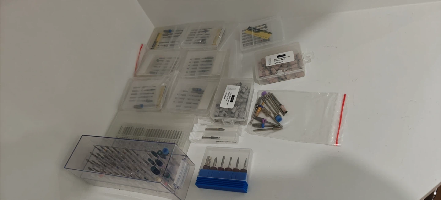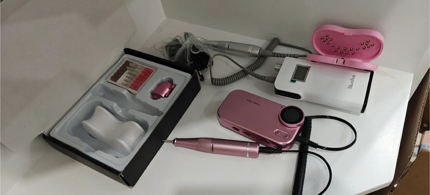 A comprehensive set of nail art supplies including polishes, brushes, files, and drill bits. It also includes a professional electric nail drill machine with various attachments. All items are organized for convenient use.